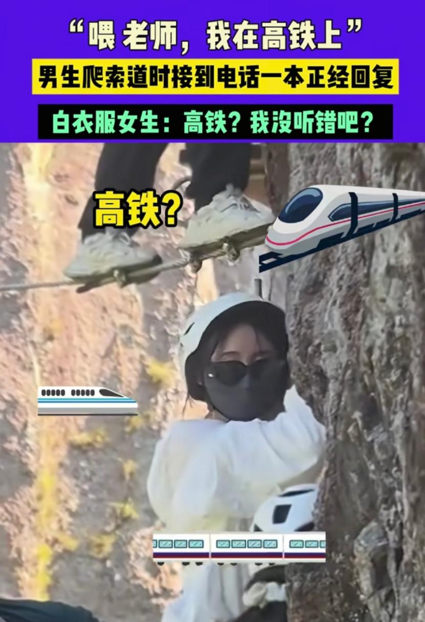 这下好了,不光老师知道了, 连全国人民都知道了! 老师问"你在哪?"男生回"高铁上",全网笑疯! 这波操作太真实了! 前天在某网红景区,索道上一个男生正哆嗦着往上爬,手机突然"嗡嗡"响。 一接通,班主任声音透着火气:"你人呢?作业交了吗?"男生淡定回:"老师,我在高铁上,一会再回你!" 旁边穿白裙子的姑娘当场石化——她刚在高铁上,正要去景区玩! 手机偷偷录下全程的她,眼珠子都快瞪出来:"这哥们也太敢了吧?" 周围游客瞬间围成圈,手机镜头齐刷刷怼过来。有人笑喷:"老师怕不是要气到摔手机!" 有人竖起大拇指:"这学生太会了,赶DDL的狠人!"还有人喊:"赶紧发抖音,这素材绝了!" 男生挂完电话,恐高症直接消失!手速快得像开了倍速,"哗啦啦"就爬到顶。 一边爬一边念叨:"电脑里PPT还没交,明天组会要完蛋!" 更绝的是,他下意识伸手摸安全扣,差点把绳子松开。好在景区工作人员眼疾手快,一把按住他手:"兄弟!安全第一啊!" 这视频一发,评论区直接炸锅!"老师肯定在朋友圈刷到这视频了!" "当代学生赶DDL的社死现场,太真实了!" "真怕他边打电话边解安全扣,还好工作人员及时!" 说实话,这男生不是不尊重老师,是真怕电脑里存的PPT要凉! 现在谁不是一边怕高一边赶截止日期? 昨天我赶方案到凌晨,手机响了才想起忘存档,手抖得跟筛子似的。这不就是当代年轻人的日常吗? 看到他挂电话后那股"我要赶紧拿到电脑"的劲儿,我直接笑出眼泪。这哪是恐高?这是"赶命似的焦虑"啊! 朋友们,你们说:是该先回老师电话,还是先抢回电脑? 评论区见真章!