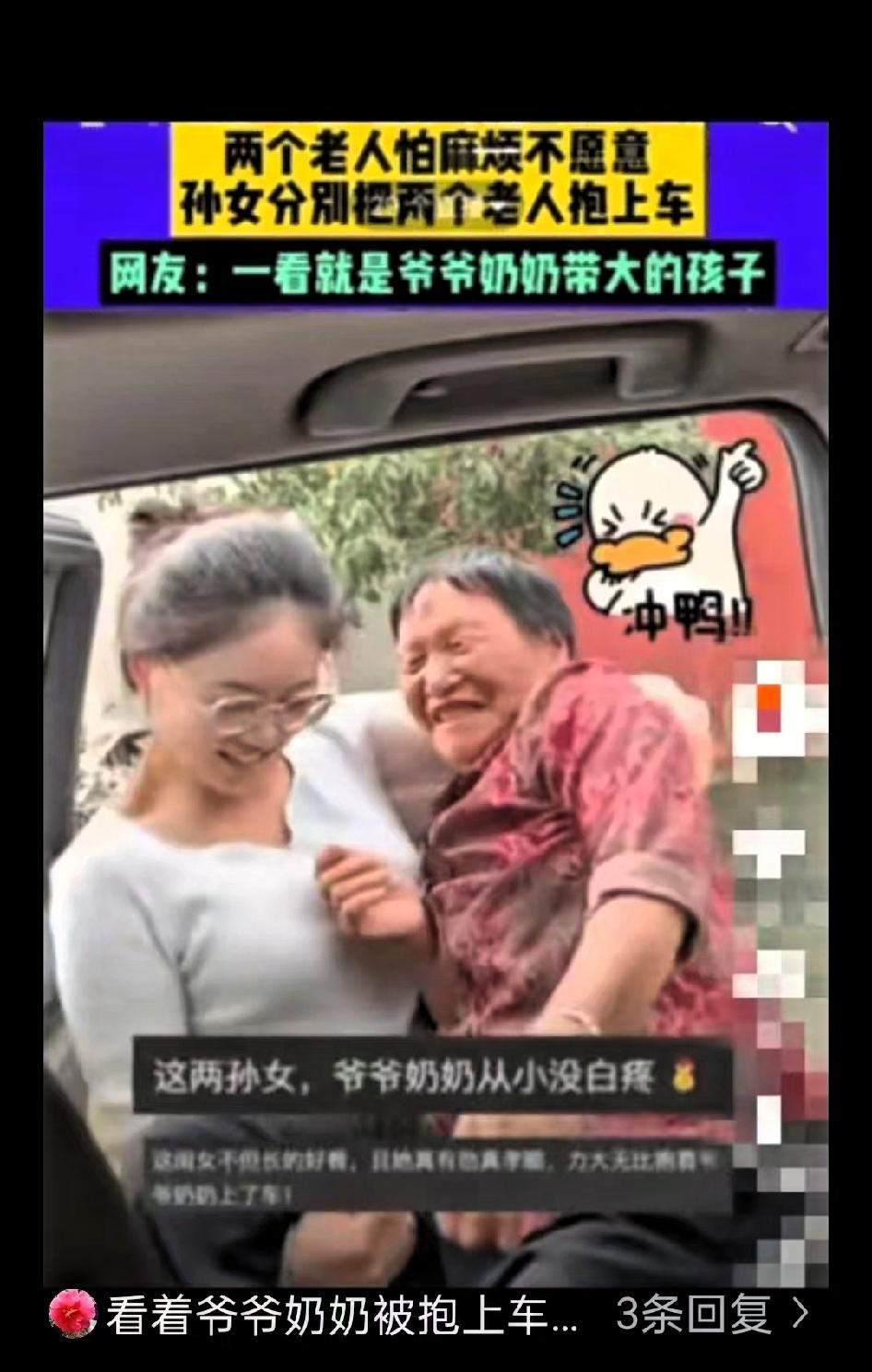 被戳中了!”河南,一女孩放假想带爷爷奶奶去县城吃饭游玩,两个老人怕麻烦不愿意上车 嘴里念叨着“别折腾了”“怕给你添麻烦”,脚就没往车边挪一步。结果姑娘啥也没说,撸起袖子直接“硬核”出手——先蹲下来稳稳抱住爷爷,慢慢挪到车旁扶上去,又转身把奶奶也轻轻抱了过去,动作干脆又透着股执拗,旁边人看着都忍不住夸:“这闺女,真把老人疼到心坎里了!” 哪是姑娘力气大啊,这分明是把小时候爷爷奶奶宠她的劲儿,全攒着还回去了!想想小时候,爷爷总扛着她赶庙会,把她架在脖子上看舞龙,自己累得满头汗也不放下; 奶奶总把糖藏在棉袄内兜,趁爸妈不注意就塞给她,怕她看着别家孩子馋得慌。那些年老人把她捧在手心疼,现在姑娘长大了,哪能让老人总为自己将就? 老人说“怕麻烦”,其实是怕花孩子的钱、耽误孩子的时间,可姑娘偏不接这份“客气”——她知道老人一辈子在村里操劳,没好好去县城享过福,所以才用这种最直接的方式,把“我想疼你们”藏在抱抱里。没有啥漂亮话,就用实打实的行动,比买多少营养品都让人暖。 网友说“一看就是爷爷奶奶带大的”,这话太戳心了!隔代亲最动人的,从来不是啥大场面,就是这种小时候你把我护在怀里,长大后我把你护在身后的双向奔赴。日子里的甜,全藏在这些不刻意的小举动里。