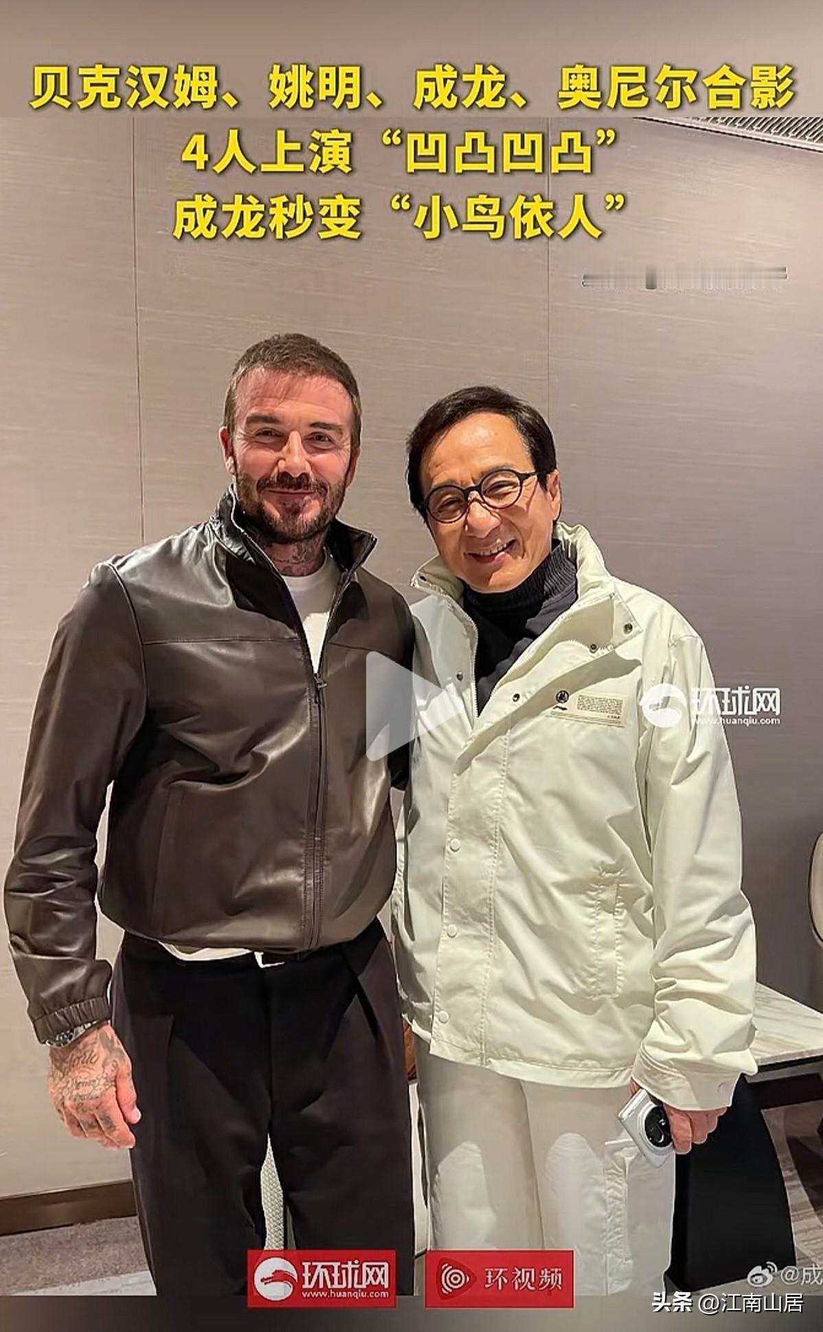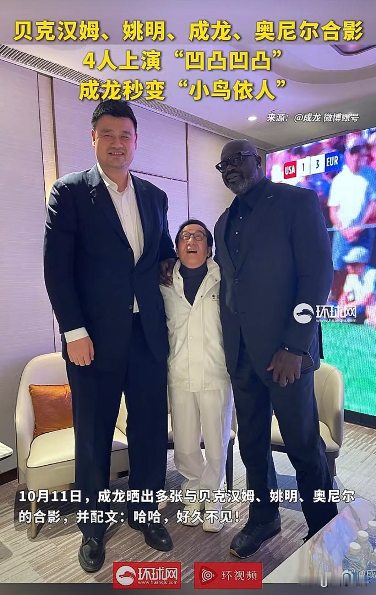 非常有喜感!贝克汉姆、姚明、成龙、奥尼尔合影,4人上演“凹凸凹凸”。成龙秒变“