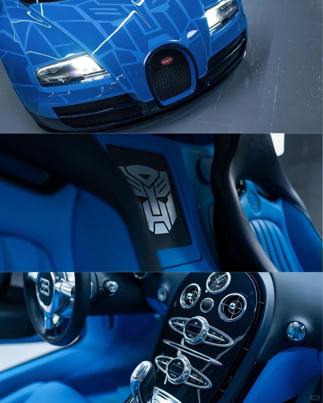 车辆的涂装经过精心设计,灵感源自《变形金刚》系列,其蓝黑双色调碳纤维车身的前部绘有该系列标志性logo。