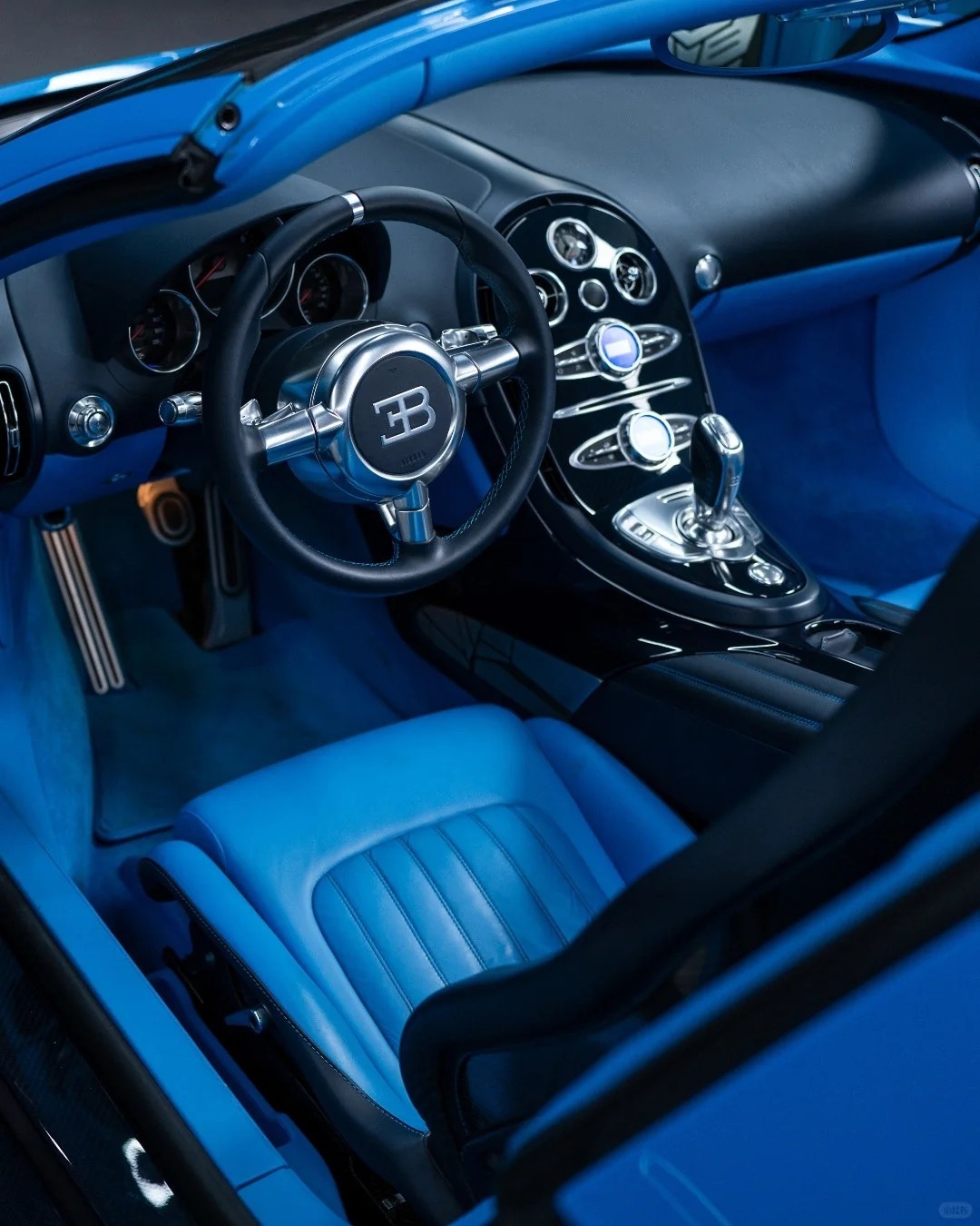 内饰主题与之呼应:布加迪运动舒适座椅之间镶嵌着一个铝合金材质的博派logo,座椅本身采用蓝黑双色调皮革搭配对比鲜明的蓝色缝线,鲜明而时尚。