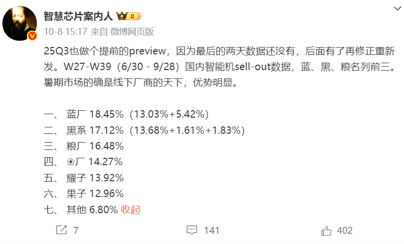 如果你问一个路人谁是中国智能手机市场的老大?很多人可能会提到苹果、华为或者小米。实际上,从市场份额的角度来说,蓝厂最近几年非常强势,刚刚过去的第三季度,蓝厂的国内市场出货量依旧是第一。