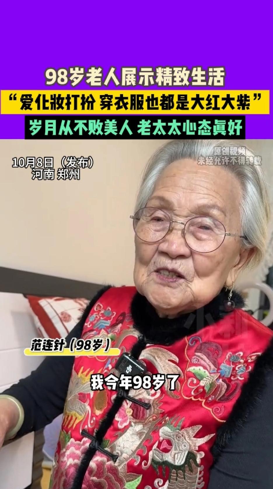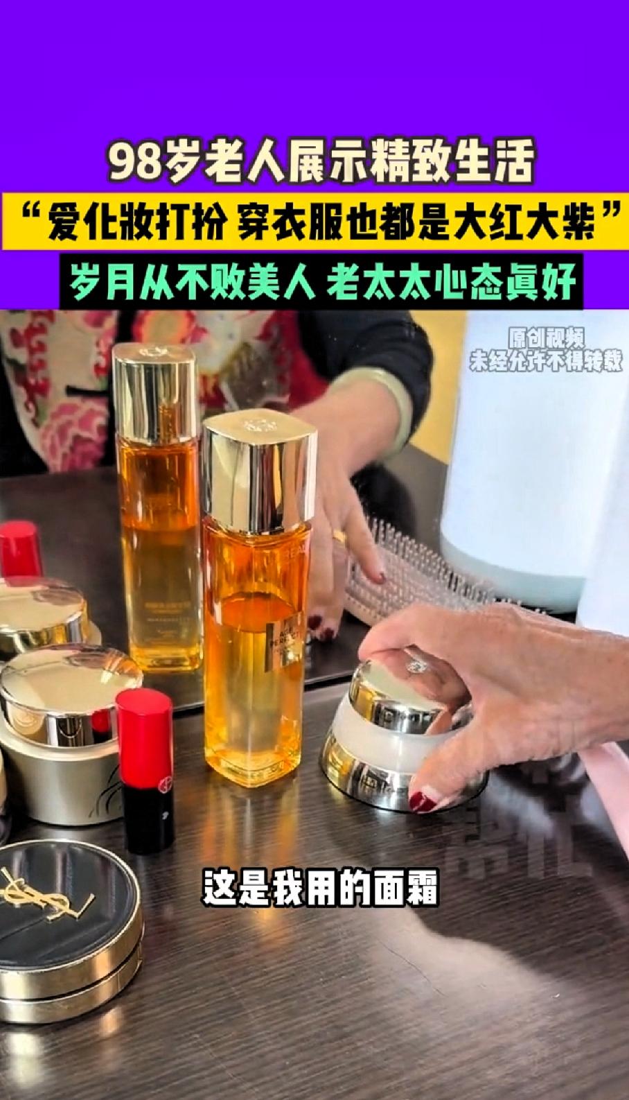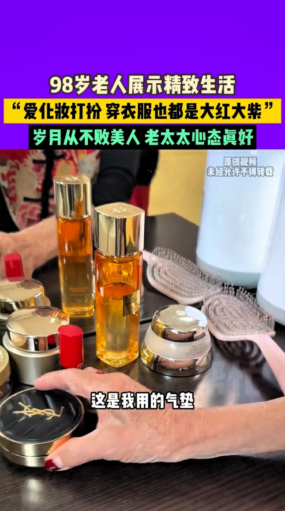98岁老人展示“精致生活”爱化妆打扮 穿衣服也是大红大紫。岁月从不败美人,老太太