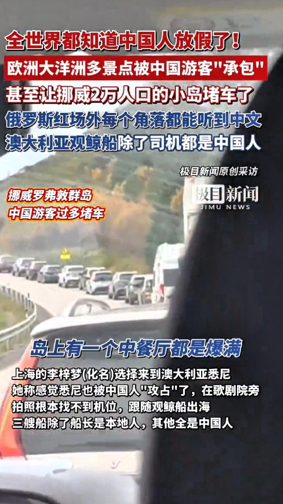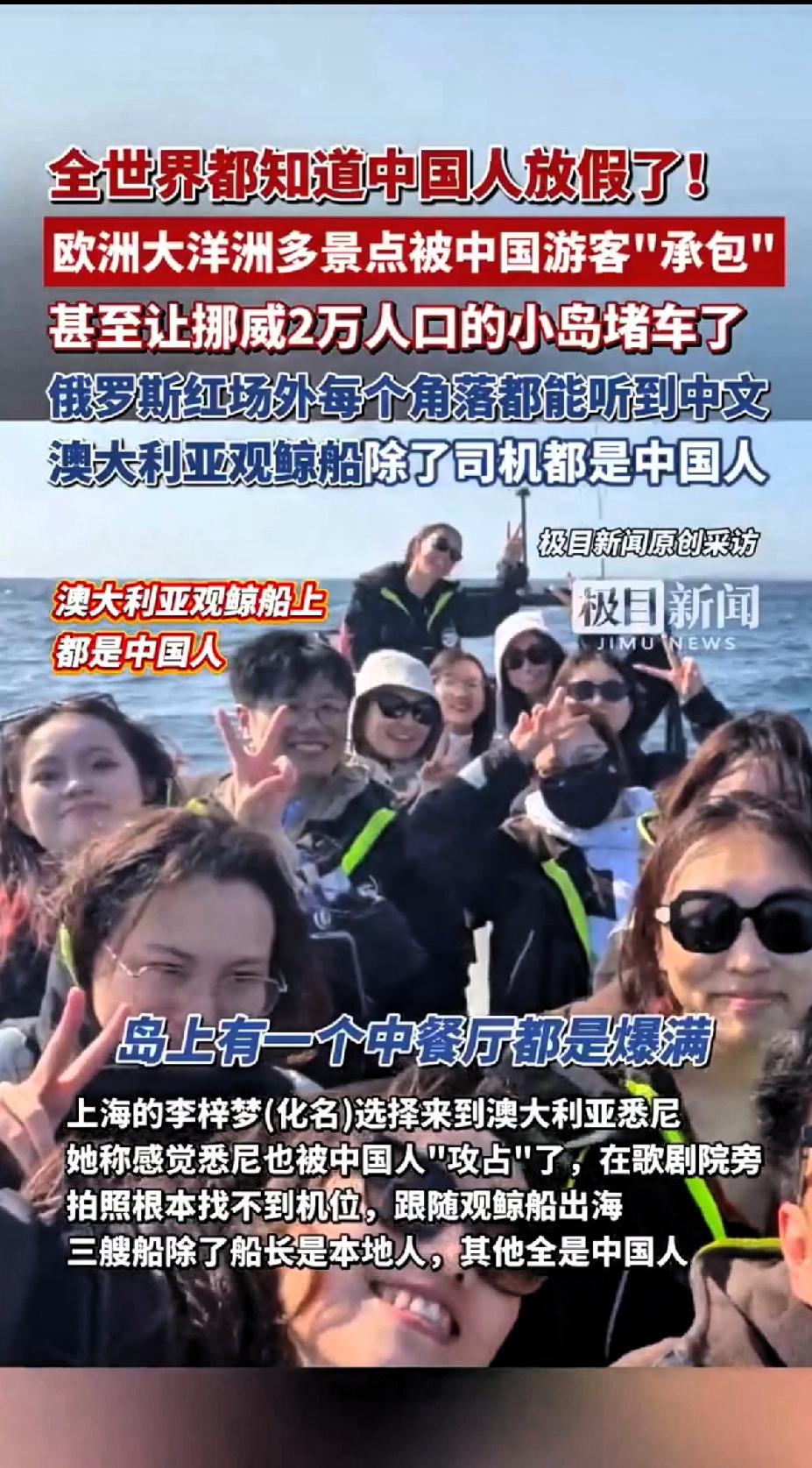 全世界都知道中国人放假了,全国超23.6亿人次跨区域流动,中国游客的身影遍布全球。在澳大利亚悉尼的观鲸船上,华人万先生看到的都是中国年轻人;瑞士采尔马特小镇上,到处能听到熟悉的普通话,让人恍惚以为在国内。 中国游客所到之处,当地经济也热闹起来,挪威罗弗敦群岛的中餐馆常常爆满,需排队等位。海外博主还跟风拍“假装和中国朋友一起放假”的视频。新加坡《联合早报》等媒体也报道这一盛况,足见中国经济复苏和国民消费能力提升。 牢笼里待久了 一下子放出来都是一群人 一群人的 这个景观只有中国有[呲牙] 到哪听到的都是中国话,跟在国内有什么区别[捂脸]中国人逼着外国人学说中国话。 这下全世界都知道我们中国在放假了挪威的罗佛敦群岛常住人口本来只有两万多,本该是一个人烟稀少的地方却赶上了我们中国放国庆,结果就是这样一个地广人稀的小岛直接因为中国游客的到来被干到了堵车还有澳大利亚的观鲸船,三艘船出海,结果除了船长是本地人其他全是中国人,都说大环境不好啊,国庆放假朋友圈里80%的都在国内旅游。20%都在国外。就我在家待着。哪都不敢去。原来发现我才是那个大环境。[捂脸][捂脸][捂脸][流泪][流泪][流泪]全球见证中国长假奇观:从挪威峡湾到悉尼港湾,世界都说“你好”以后普通话 越来越普通了,想挣中国游客的钱,前提是学说普通话。