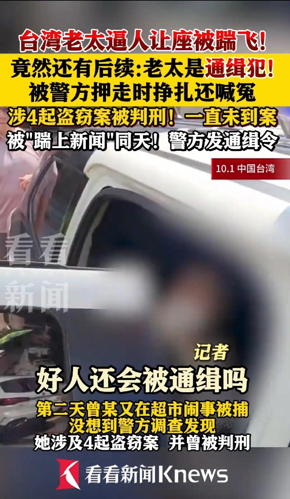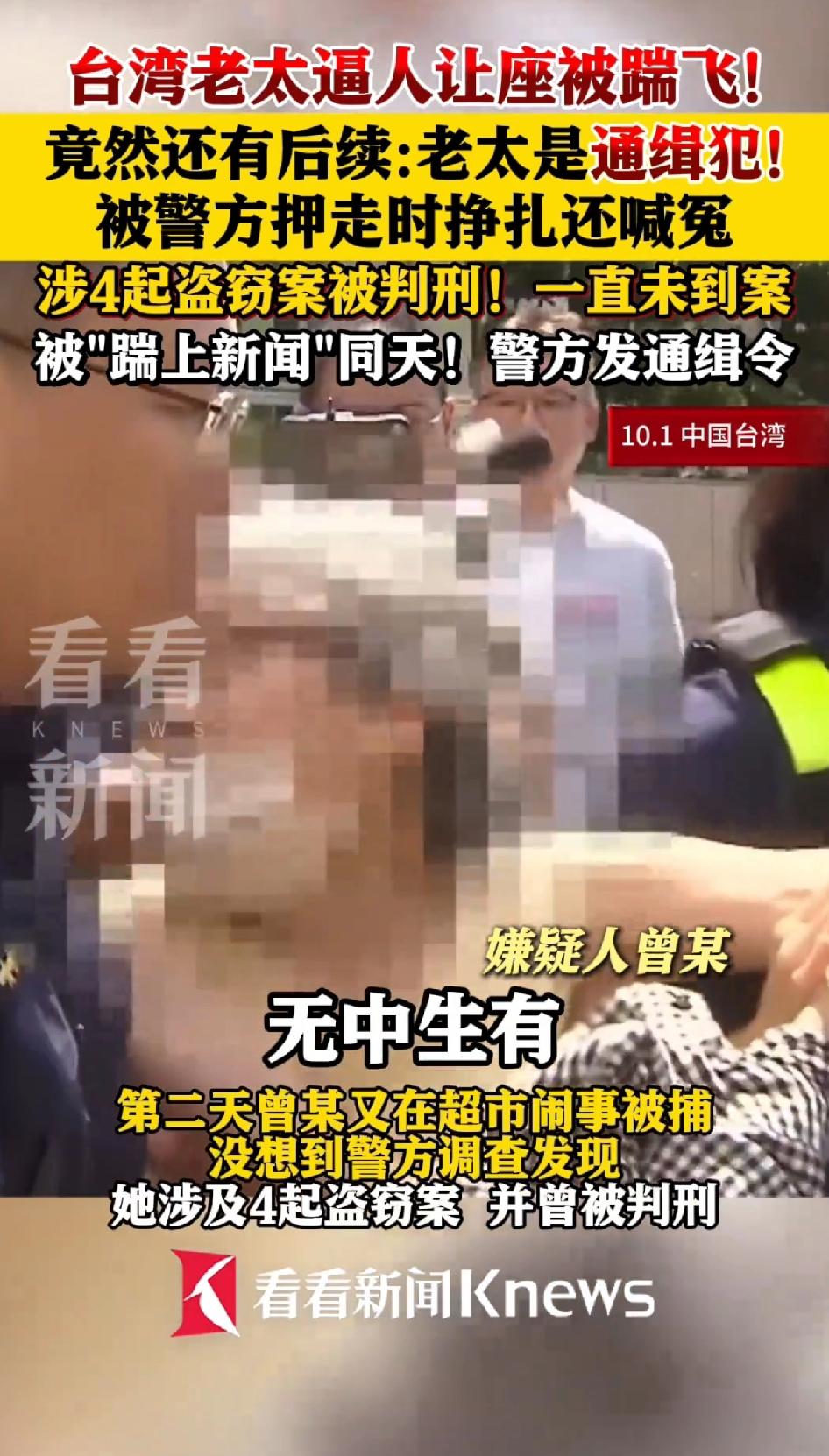 台湾老太逼人让座被踹飞,竟然还有后续:老太还是通缉犯,被警方抓走时还挣扎喊冤。涉事4起盗窃案被判刑!一直未到案。被“踹上新闻”同天!警方发布通缉令。 台湾73岁老太曾某9学30日在台湾捷运强行要一年轻人让座,用包打击对方后被一脚踹飞。第二天曾某又到超市闹事被捕,没想到警方调查她涉及4起盗窃案 并曾被判刑,一直未到案。曾某被抓捕挣扎时嘴里喊着;对方无中生有,我是好人,你们抓错了,警方:好人还会被通缉吗? 真是倚老卖老,身上背着多起案子,一点也不消停,各种找事闹事。 看来是被踹的太轻了,第二天还能到超市去闹事。 所以啊,坏人哪怕是老了,哪怕是在地铁一个小环境,都会暴露其骨子里的坏[灵光一闪]。 那么踹人的那位年轻人岂不是立功了,应该奖励 要是在咱们这,有几个敢去踹老人的。碰到这种无理的老人,只怕赶紧躲得远远的。碰到她都怕被讹,别说上脚踹。佩服这个年轻人,不惯着对方,一脚下去老实了。这老人虽然73岁,被踹后也是很不在乎,还在指责对方,只是不敢再动手了。到了第二天又去超市闹事被抓捕归案。离了个大谱!才知道老人背了4起案子,一直未到案。 看吧!坏人再坏都不觉得自己有问题!都被通缉了,还在怪别人弄错了。被抓走还觉得自己冤枉。