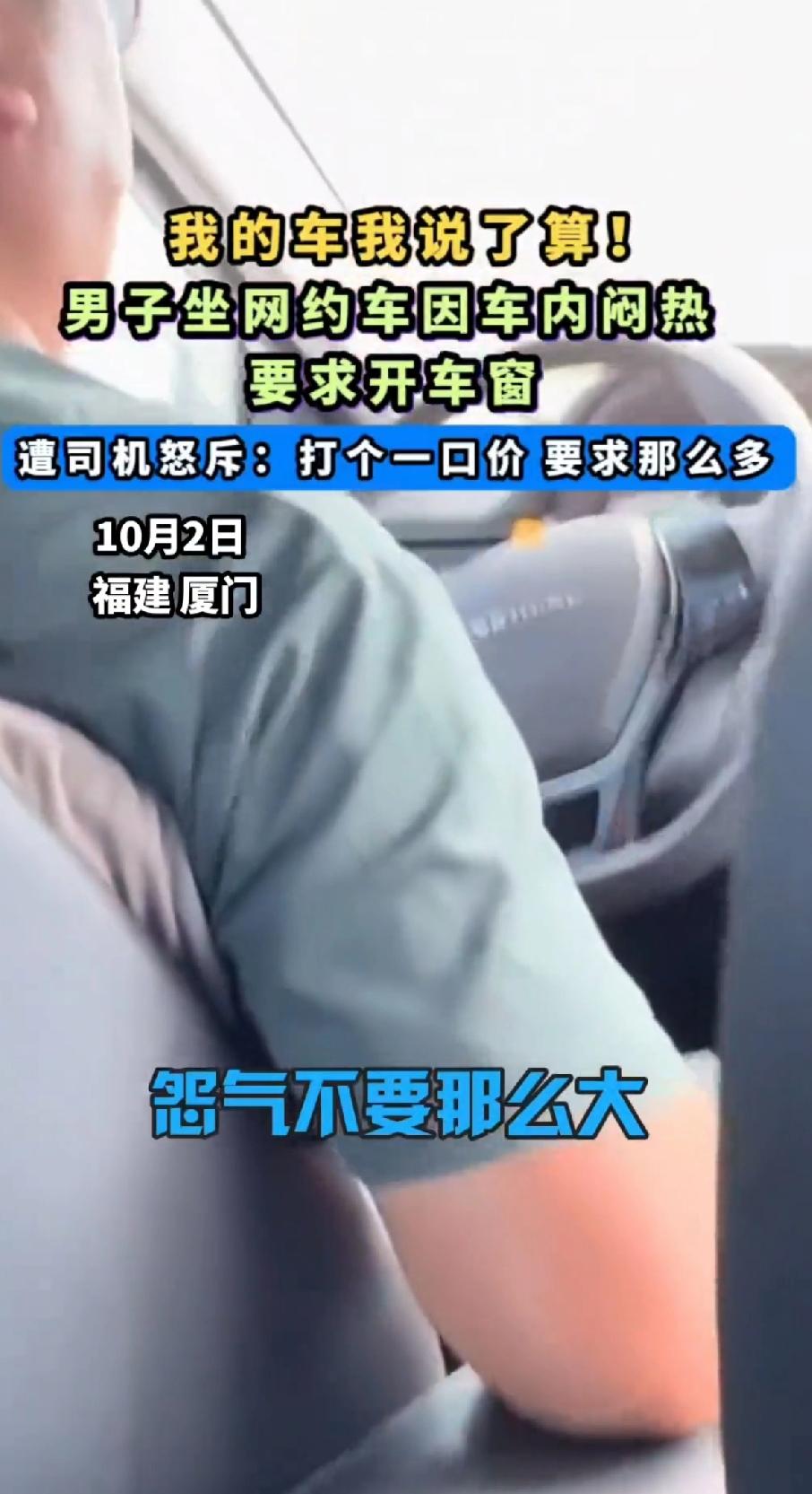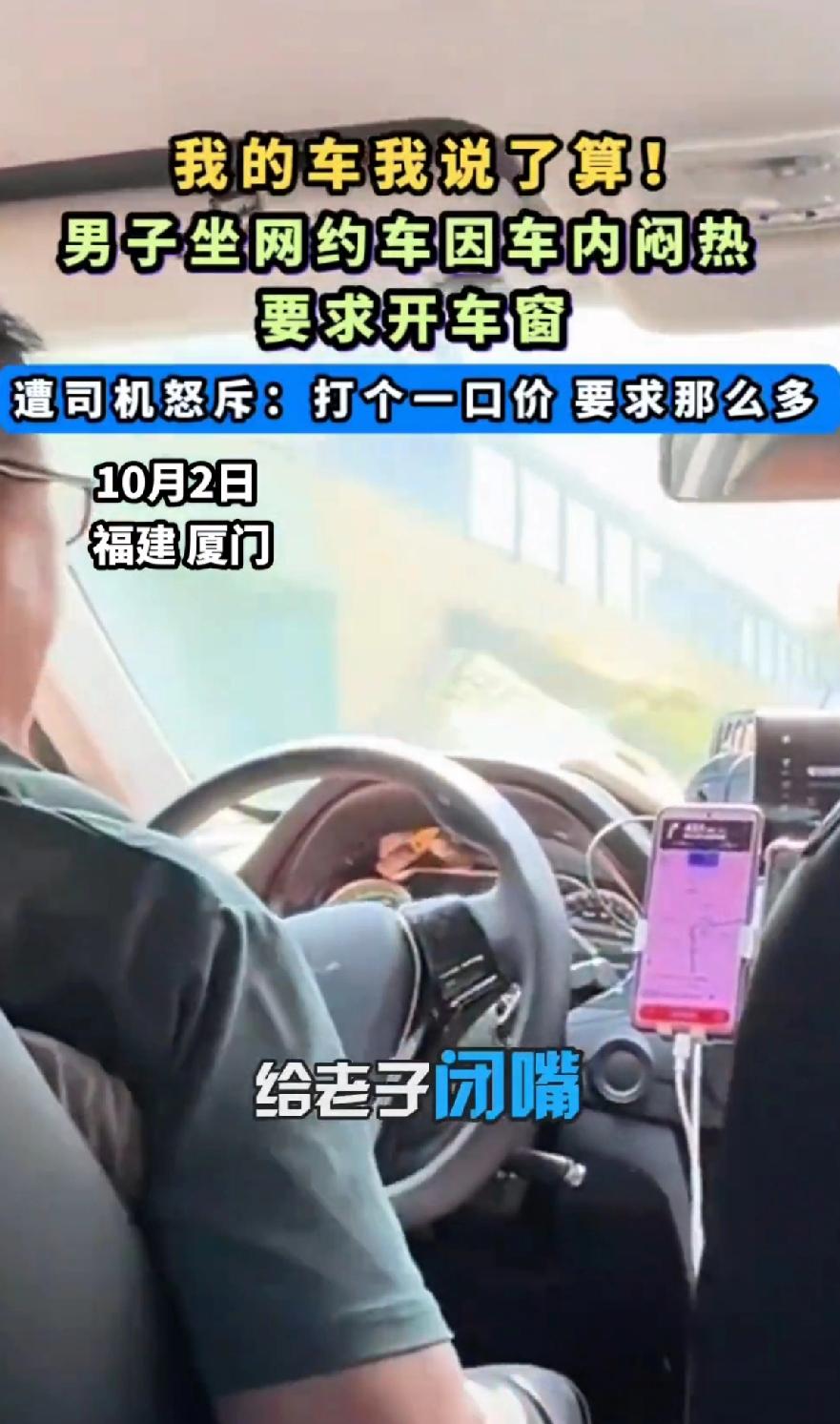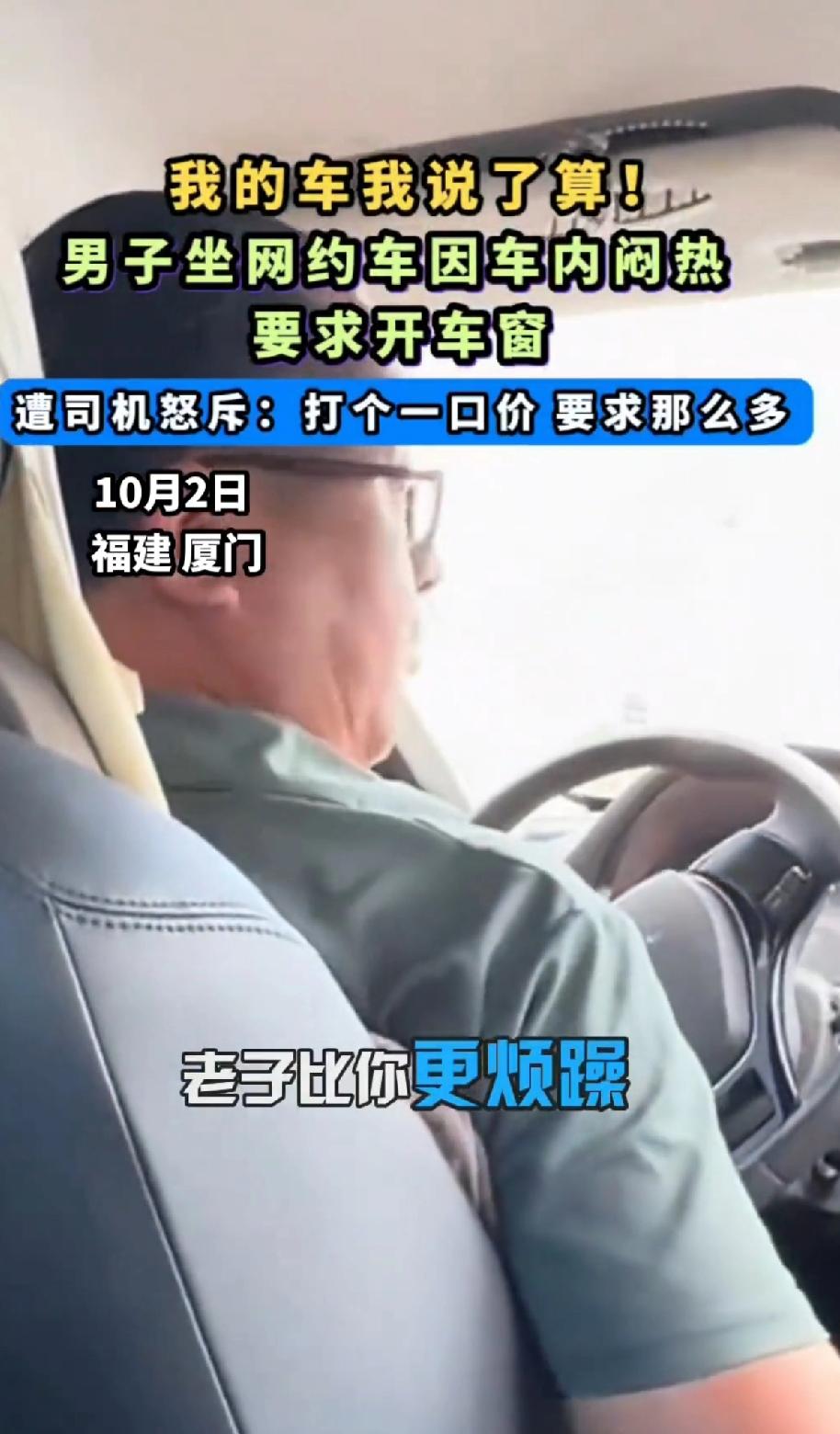 乘客打车,多了一个“爹”司机一口一个“老子”说道:我的车我说了算!男子坐网约车因车内闷热要求开车窗 遭司机怒斥:打个一口价要求那么多 我的车我说的算。乘客:可是你空调不冷,我快要热死了,我这会很烦躁。 司机:你给老子闭嘴,老子比你还烦躁。打个一口价的车就这样,你为什么要打一口价? 乘客:那你为什么要接呐?我只是要求开一会窗,怎么不行了? 司机:你不要把我逼到极限,老子比你更烦躁。 乘客:你别怨气那么大,我只是要求开一下窗,我热的不行了。 司机:不行就死,我的车我说的算! 乘客:我要下车,你要退我钱。 司机:大喝一声给老子闭嘴,打个一口价,退你个毛线。 视频里看他俩对话,这样的司机真是太少见了,整个一个怨气很重的路怒。网约车公司平台多,竞争激烈,司机鱼龙混杂,管理不当什么素质的人都有。这个司机和乘客的对话也很吓人。总觉得下句话,司机会不会做出什么极端的行为? 乘客倒也沉住气,一直劝他不要怨气那么大,只是开下窗,不要发那么大的脾气。 这司机也是接的一口价,便宜可以不接呀!接了对乘客发那么大的脾气。 好像因为对方打了一口价,司机就应该把怨气全部撒到乘客身上。 这哪是打车?这是在试探生命!看了整个视频,都感觉这样的司机太可怕了!稍不顺心就可能做出极端的行为。 嘴里喊着让乘客去死!一口一个老子喊着。乘客打了车,平白无故多了个爹。直到下车乘客还后怕,一直劝司机一定要平平安安,不要发脾气。