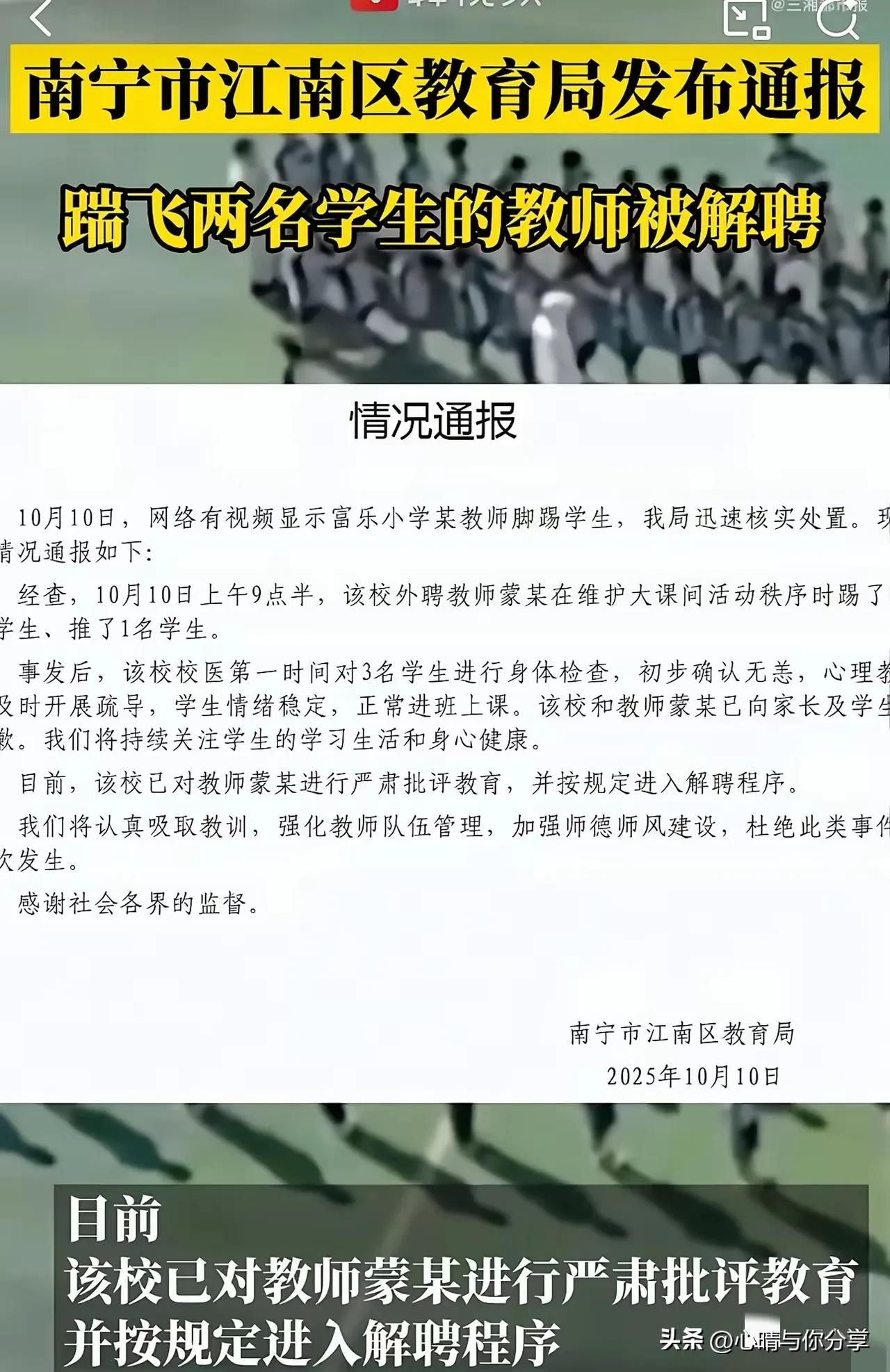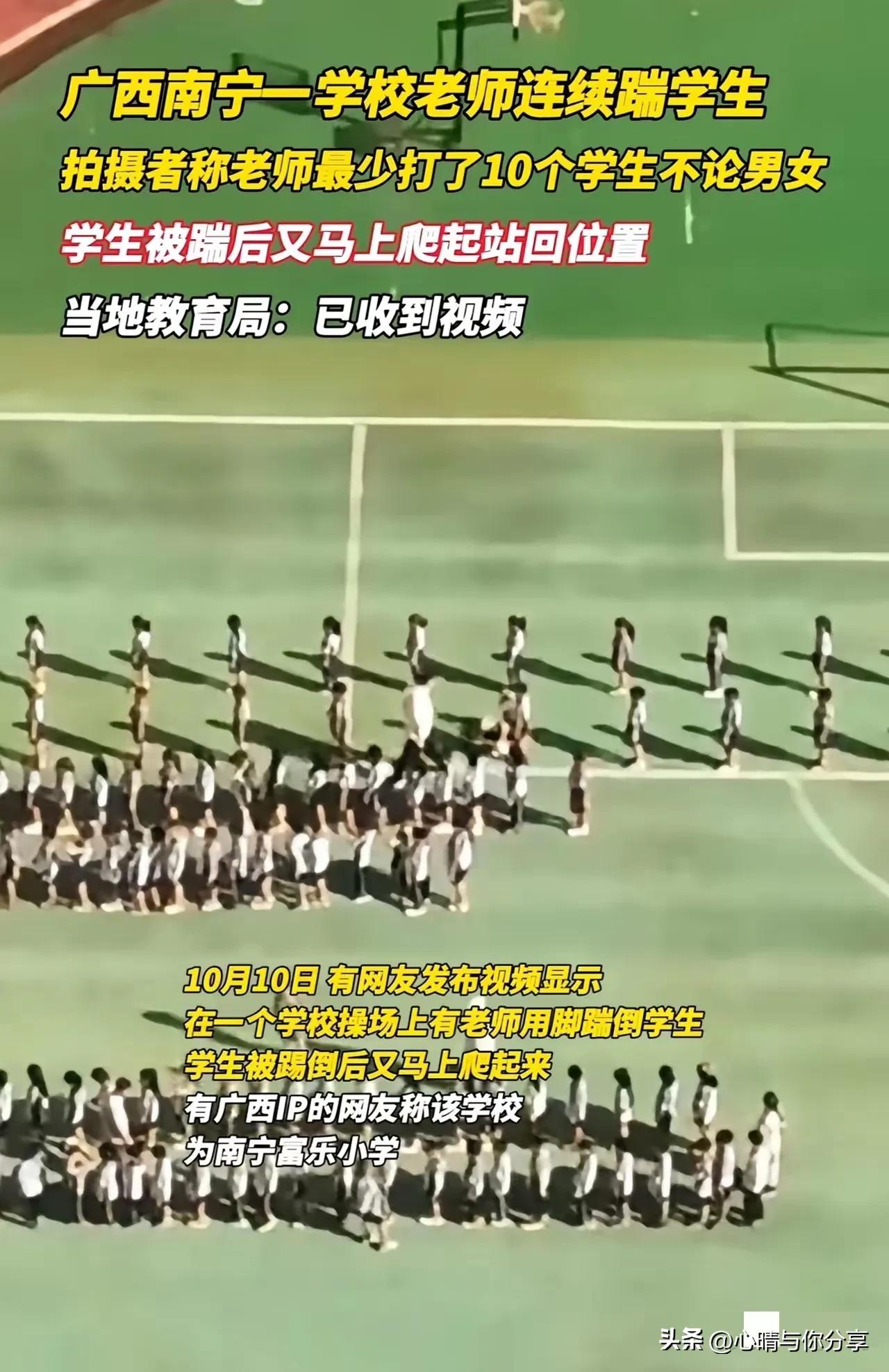 南宁富乐小学的校长汤莹这两天应该头都大了吧, 自家外聘教师竟然在大课间活动中脚踹
