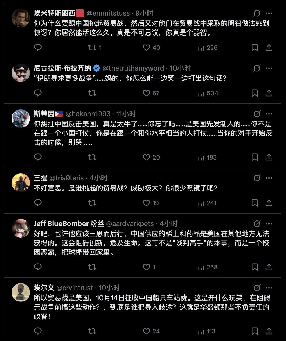 特朗普连发两贴抨击东大,但美国老百姓的眼睛是雪亮的。 特朗普抨击东大的反制是“阴险和敌对的举动”,他还在另一个声明中污蔑中方发起了新贸易战。 但是美国老百姓的眼睛是雪亮的。基本观点是:美国人首先挑起了贸易战,而现在特朗普自食其果。特朗普的傲慢和愚蠢会毁了美国。美国人民可能应付不了,会输掉贸易战,美国会首先承受不下去,因为美国什么也不生产,而中国生产一切,这就是真相。特朗普发难 中美贸易战谁才是最后的赢家