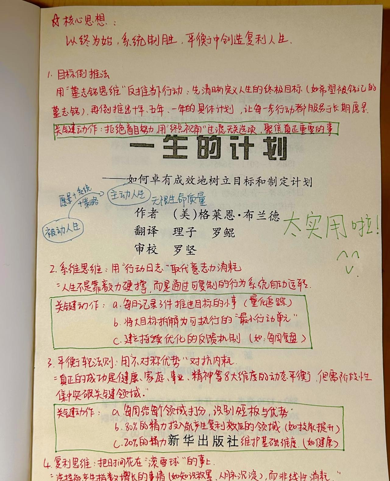 熬夜也要看完的一书。相见恨晚!这本冷门经典,把我从“瞎忙”中打醒 你是否也有这样的体验: - 日程表密密麻麻,回头却想不起时间花在了哪里 - 定了无数目标,却总在起步阶段就莫名卡壳 - 渴望突破现状,却不知从何下手,年复一年在原地打转 ✦ 直到遇见《一生的计划》,我才恍然大悟:那些真正改变命运的人,不过是掌握了把愿景转化为行动的底层逻辑。 ❶ 从终点思考现在,让努力有的放矢 曾经的我陷入“准备陷阱”——总觉得自己还没准备好,迟迟不敢迈出第一步。 书中提出的“终点视角”让我茅塞顿开:“如果你知道自己五年后会成为什么样的人,今天的选择会有什么不同?” 我用这个方法重新规划职业转型: - 不再纠结“什么时候才能准备好” - 转而思考“为了实现目标,今天必须做什么” - 把模糊的渴望转化为具体的能力清单、资源地图和时间节点 转变思路后,我突然看清:每天专注两小时深耕核心技能,远比应付琐碎任务更有长远价值。 ❷ 建立持续行动系统,告别意志力消耗 曾经的我迷信“咬牙坚持”,结果总是三天打鱼两天晒网。 这本书点醒了我:“可持续的动力不来自意志力,而来自看得见的进展。” 我设计了属于自己的“进展看板”: - 每日记录三件推动目标的小事 - 每周复盘哪些行动真正有效 - 每月回顾成长轨迹 三个月后,当我翻看满满的记录才明白:不是有了结果才坚持,而是坚持久了自然会有结果。 ❸ 找到人生平衡点,摆脱内耗循环 在“拼命”和“躺平”之间反复摇摆,是很多人的常态。 书中提出的“人生平衡轮”让我意识到:“真正的成功,是各个关键领域都能达到及格线以上。” 当我客观评估生活的八个维度时,惊讶地发现: - 事业投入过度,健康严重欠账 - 人际关系单一,精神生活匮乏 于是我开始调整: - 用固定作息替代熬夜加班 - 用深度社交替代无效应酬 - 用刻意休息替代报复性放松 两个月后,精神状态焕然一新,工作效率不降反升。 合上这本书的那个夜晚,我在笔记本上写下: “人生不是被动的马拉松,而是主动的建筑设计。 每一天,我们都在为自己的未来添砖加瓦。” 也许我们无法回到十年前提前读到这本书 但从今天开始践行其中的智慧 就是给未来自己最好的礼物 你有哪些“恍然大悟”的时刻?欢迎在评论区分享你的觉醒瞬间~