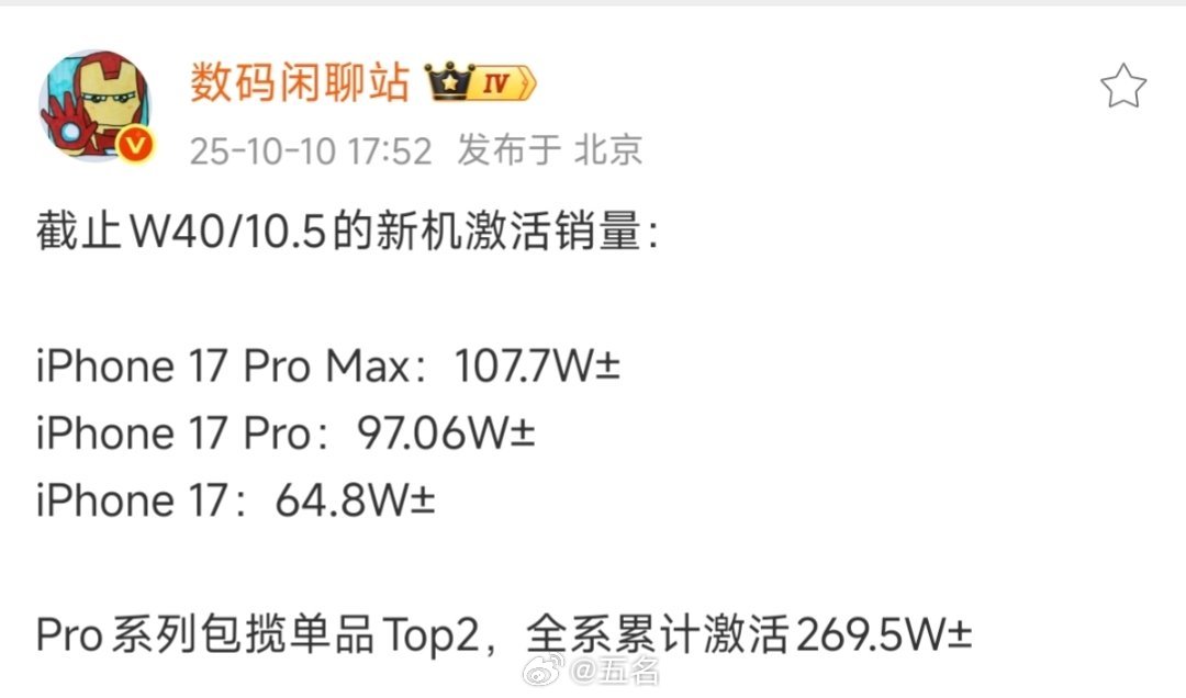 Pro系列包揽单品Top2,全系累计激活269.5W±