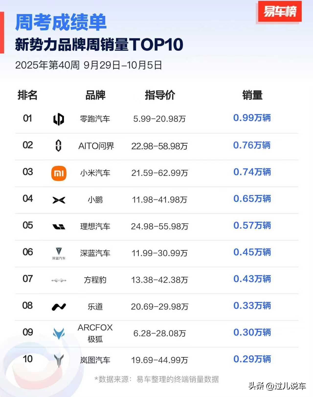 新势力最新周销量出炉,零跑依旧稳居第一,国庆订单再破纪录! 根据最新统计的数