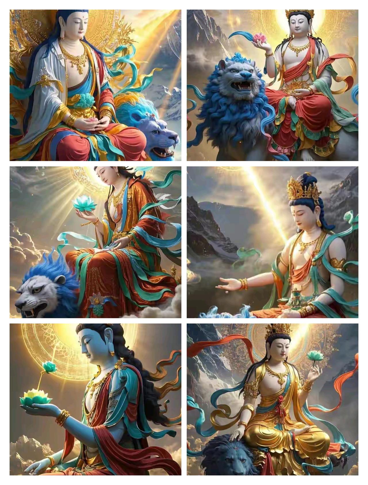 开学季,多制作几期文殊菩萨图哈,祝愿全国学子学业有成,心想事成,智慧如海,前程似锦,早日上岸!每一期的文殊菩萨图懵一看都是一个样,仔细看却又不一样,这些图没有一张是重样的。 这一期的文殊菩萨图在前几期的基础上进行了稍微的调整。除了延续前几期金刚智慧剑、青莲花与青狮等元素,还增添了灵动的小鸟,为画面注入了生机与活力。 金刚智慧剑象征斩断无明,青莲花代表清净智慧,青狮则彰显威猛与无畏,而新加入的小鸟则仿佛在聆听菩萨的智慧之音,这样使得文殊菩萨的画面增添了一丝小小的灵动。整体构图既保留了文殊菩萨的智慧与威严,又通过小鸟的点缀,让画面更具可看性与亲和力,令人心生欢喜与敬仰。大家看完,有没有这种感觉?评论区留下您的建议。 喜欢哪一张图片做屏保,自行下载哈,评论区吱一声就行。