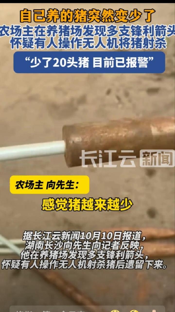 “偷猪都用上高科技了!“湖南长沙,男子发现自家养的猪越来越少,觉得不对劲的他一找,竟然在周围找到十几根箭头。网友:“现在是射猪,指不定哪天就射人了!” 向先生他在一百亩茶山上散养了一百多头猪,本来都长得挺壮实,可最近清点的时候,他发现猪竟然少了20头!这些大猪每头都有好几百斤,算下来足足亏了六七万块,可不是一个小数目啊。 向先生急得在周围来回晃悠,还真让他在围墙外边找到了几支沉甸甸的金属箭头,每支差不多都有一斤多重。他琢磨来琢磨去,觉得这事可能不简单,很可能是有人用无人机带着这些箭头,悄无声息地飞到空中,瞅准大肥猪,然后嗖的投下箭头……不过因为茶园山场太大,监控也不可能全覆盖,所以现在向先生也没辙了,短时间内估计很难找到是谁干的。有网友说,用无人机偷猪?这贼也太先进了吧!真是防不胜防啊。 网友们在评论区炸开了锅,纷纷表示“长见识了”,还有人调侃道:“现在的小偷都这么卷了吗?没点技术都不敢出来混了。”不过玩笑归玩笑,更多人还是感到后怕,就像有位网友说的:“这次是射猪,万一哪天操作失误,或者目标换成了人,那后果不堪设想!”大家普遍认为,这些人把聪明才智用错了地方,如果将这份心思用在正途上,说不定早就成就一番事业了。 目前,向先生已经报警,希望警方能尽快查清真相,揪出幕后黑手。同时,他也提醒其他养殖户多加防范,毕竟“道高一尺,魔高一丈”,在高科技犯罪面前,传统的防盗措施可能真的不够用了。 对于这件事,你有什么看法呢?是觉得匪夷所思,还是对这种高科技犯罪感到担忧?欢迎在评论区留下你的想法。