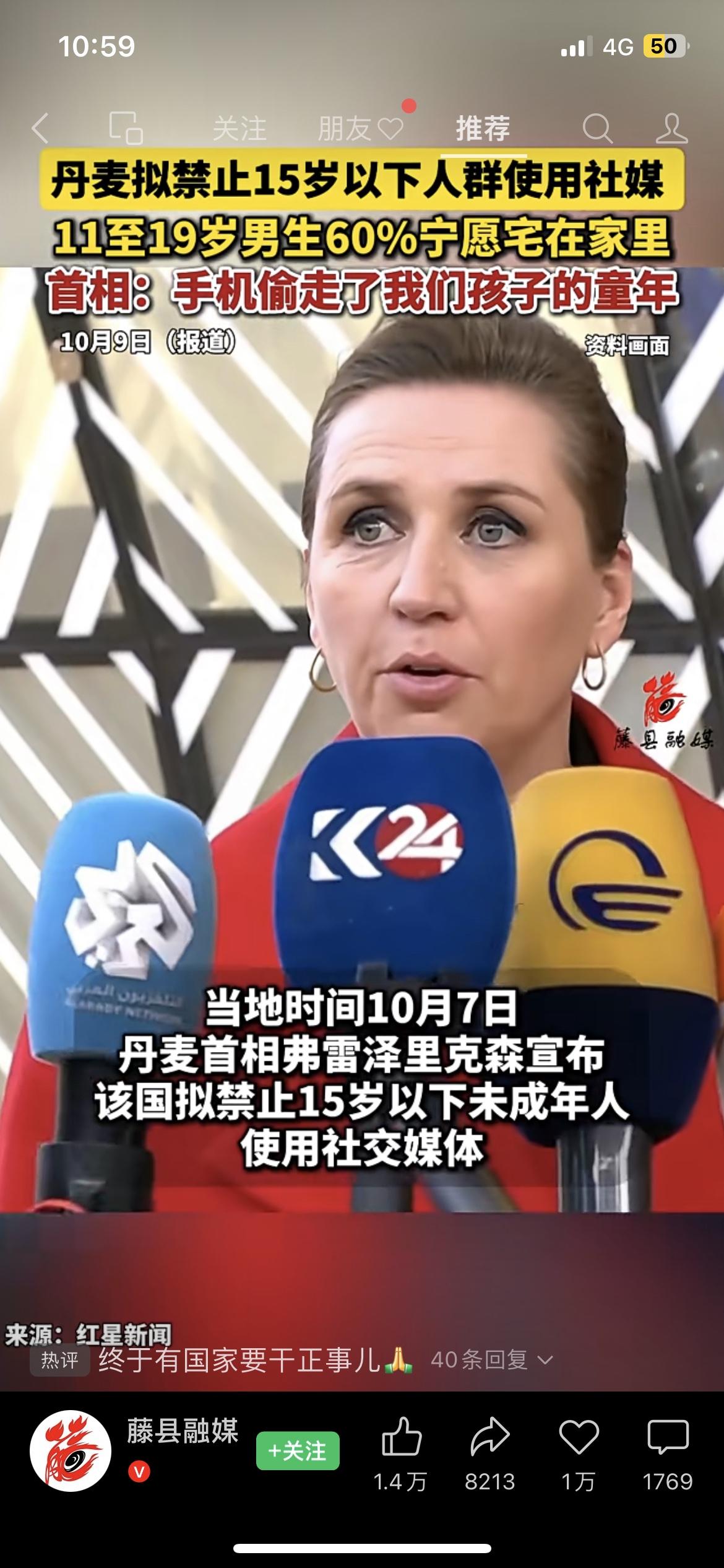 丹麦要禁15岁以下用社媒!首相:手机把孩子童年偷走了,你怎么看? 正文: 家人们