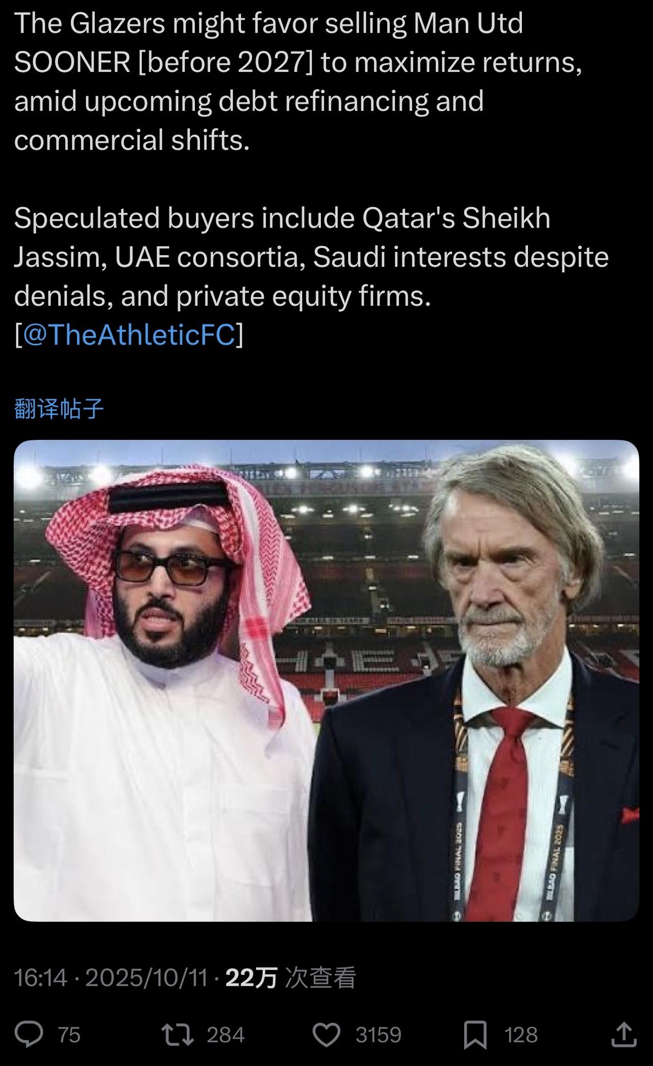 在即将到来的债务再融资和商业转变中,格雷泽家族可能倾向于尽早(2027 年之前)出售曼联,以实现收益最大化。 推测的买家包括卡塔尔的谢赫·贾西姆、阿联酋财团、沙特利益集团(尽管遭到否认)以及私募股权公司。