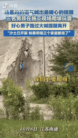 10月8日,江苏南通,三名小男孩在施工现场爬坡玩耍,完全没有意识到身边的危险,这