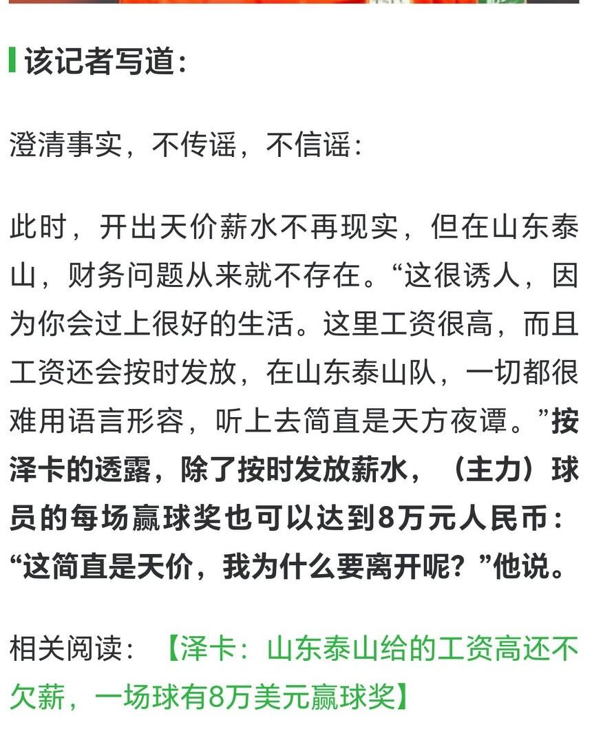 名记王晓瑞辟谣:泰山队外援泽卡所说每场赢球奖金是主力8万人民币,而非美元! 此前有媒体报道,泽卡在接受采访时表示,泰山队每场赢球奖金是8万美金。这也引起了热议,因为按照主力8万美金计算,这是天价。 而《体坛周报》记者王晓瑞辟谣很及时,因为如果按照每场赢球8万,这里说的是主力,加上几个替补,再加上工作组人员等,一场赢球奖也就在150万人民币以内。这算合理的,在现在的中超球队中,也还算是比较高的。 山东泰山队的投资在中超一向是比较靠前且稳定的。山东泰山队