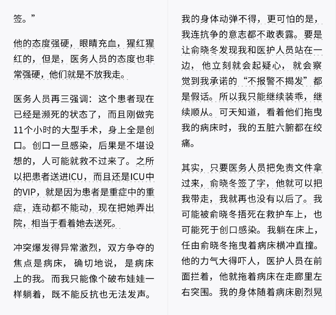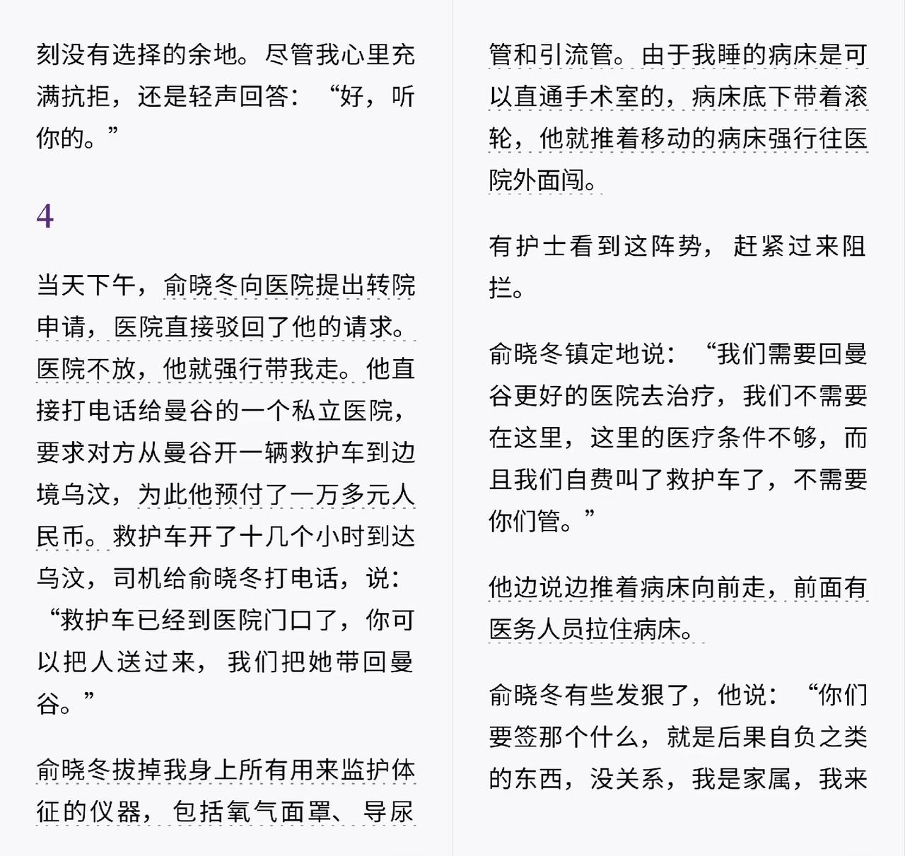 王暖暖坠崖案新细节曝光:男方曾试图从医院抢走她,甚至备好了私立医院的救护车,推着她的病床从icu冲出来希望利用丈夫身份签免责声明带走她。 是泰国医院的医生坚定地制止了俞某,死死抓住她的病床不许俞某带走她,她浑身是血的躺在病床上动也动不了,担心俞某身上带枪,担心俞某会鱼死网破掏枪击伤医护。 在选男人的眼光上,王暖暖错的彻底,但在她的生命里,出现了太多贵人。 是多么的机警聪慧,又是多么的幸运,她从崖上跌落侥幸活下来,没有被野兽撕咬,遇到好心人搭救,医院的医护没有放弃她,还能碰到勇敢的朋友愿意近身演戏,替她录下引导丈夫说出谋害自己的事实的录音。 从插翅难逃到逃出生天,王暖暖的后福,大着呢!