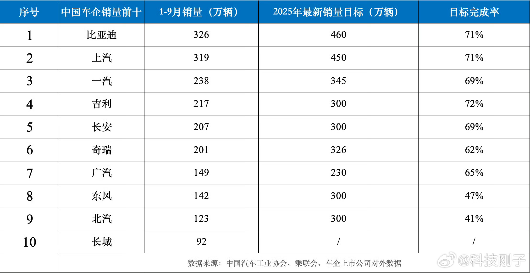 “金九银十”旺季加持下,中国车市冲刺节奏拉满,头部车企的目标完成率成了最直观的“成绩单”。多家车企销量目标达成率亮眼,比亚迪以326万辆、上汽以319.3万辆均达成71%目标,稳稳占据第一梯队,但吉利72%的完成率更显黑马姿态,成前十中最“快”选手。