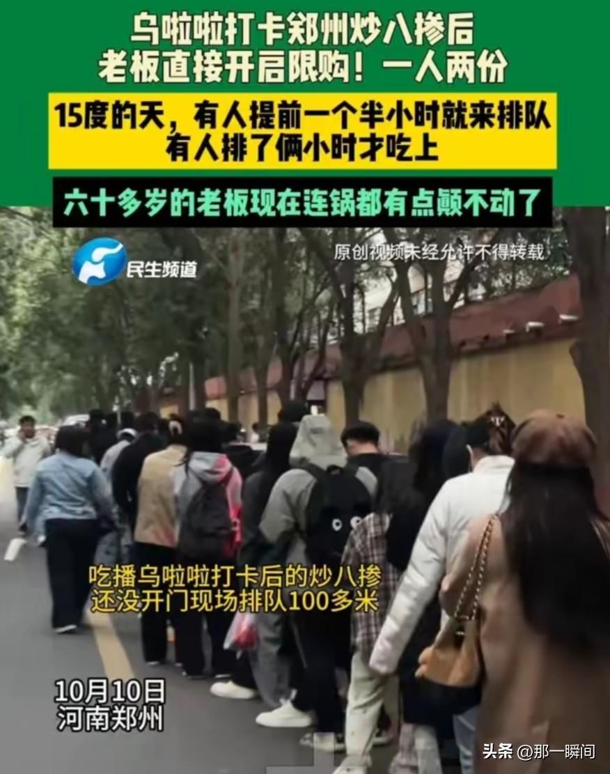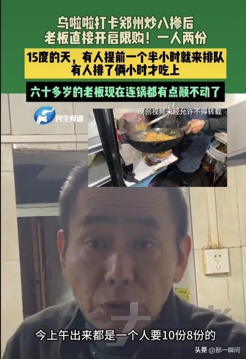炒八掺是啥啊,有那么好吃吗?有人排队2个小时就为了吃炒八掺,大爷那天抽着烟跟乌啦啦聊天的时候是年前最悠闲的时光了。 乌啦啦打卡后的炒八掺还没有开门现场排队100多米,老板直接说每人限2份,这样都能吃到,上午有人一次性要8份10份的,后面的人得等好长时间,颠了一上午都有些颠不动了。 有人说乌啦啦真是餐饮界行走的财神爷。 鸡排哥火了,炒八掺也火了,下一个是什么呢? 为什么有些人愿意排队几个小时,就为了吃那口呢,味道真有那么好吗? 大爷在该退休的年纪,又要开始奋斗了。 大家愿意排队几个小时去吃吗?吃过的人说一下味道怎么样。