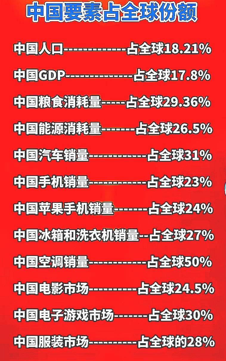 最大世界工厂,也要做最大消费市场。中国人努力生产,也理应享受美好生活! 当这组“中国要素占全球份额”的数据,铺展在您的眼前,不要感觉惊讶。因为,在这些数字的背后,是中国几十年不懈的努力,才在全球经济与消费版图中,留下如此鲜明的印记。 首先我们可以看到,中国是全球人口规模最大的国家之一(刚刚被印度超越),18.21%的人口占比,既意味着庞大的劳动力储备,也催生了超大规模的内需市场。 GDP占比则为17.8%,比人口占比略低。当然,这是以美元计价,如果去除汇率因素,按照实际购买力,肯定会超过这个数字。不过,属于发展中国家这个自我定位,还是客观事实。 第三,看粮食消耗量,这个就比较高了,占全球29.36%。这大概能够说明,中国人在吃的方面肯于投入。无论是蔬菜、水果,还是各种肉类,中国人平均消耗量,都明显超过绝大多数国家,这是毋庸置疑的事实。毕竟,中国餐饮文化源远流长,天南地北各个菜系每天挨个吃,十年八年都不带重样的。 第四,从能源消耗量占全球的26.5%,可以窥见中国工业经济的体量。作为最大的工业国,对于能源的需求,只会越来越高。 第五,再来看一下日用消费品。无论是汽车、手机,还是家电、服装,都已经占据了比较高的全球份额。尤其空调销量,占世界总量的半壁江山,不得不说,中国人还是比较喜欢享受。毕竟,光勤劳肯干可不行,有了钱,也不能亏待自己和家人。 最后,文化娱乐方面的消费,也是不甘人下。单单从电影和游戏产业来看,中国人就比较热衷。有些年轻游戏玩家,为了玩游戏,可是非常舍得投入。无论是买硬件,配置性能强的手机和电脑,还是在软件上花钱,购买游戏装备,都愿意一掷千金。 这些数据,是中国现代化社会不断向前发展的最好证明,印证了中国消费市场的活力与无尽潜力。别看房价跌了这么多,很多人都有贷款需要还,但整体消费能力,在世界上还是比较靠前的。 与此同时,从数据中也可以发现,中国从物质消费、低端消费,正在向精神消费、品质消费,进行着快速的升级。 记得多年前,美国媒体担心,如果中国人享受跟美国人一样的物质消费,整个地球都供应不起。难道只允许欧美高消费,不许中国人享受?这什么道理?我们不仅要努力搞生产,还要努力多消费,不断提高各个方面的生活水平,这才叫公平合理! 我们是最大的世界工厂,当然也要做最大的消费市场。否则,我们难道只给美西方当劳工,让他们躺着去享受吗? 内需消费 中国消费潜力 全球消费力 中国消费 中国消费者市场 中国市场消费力 全球生产