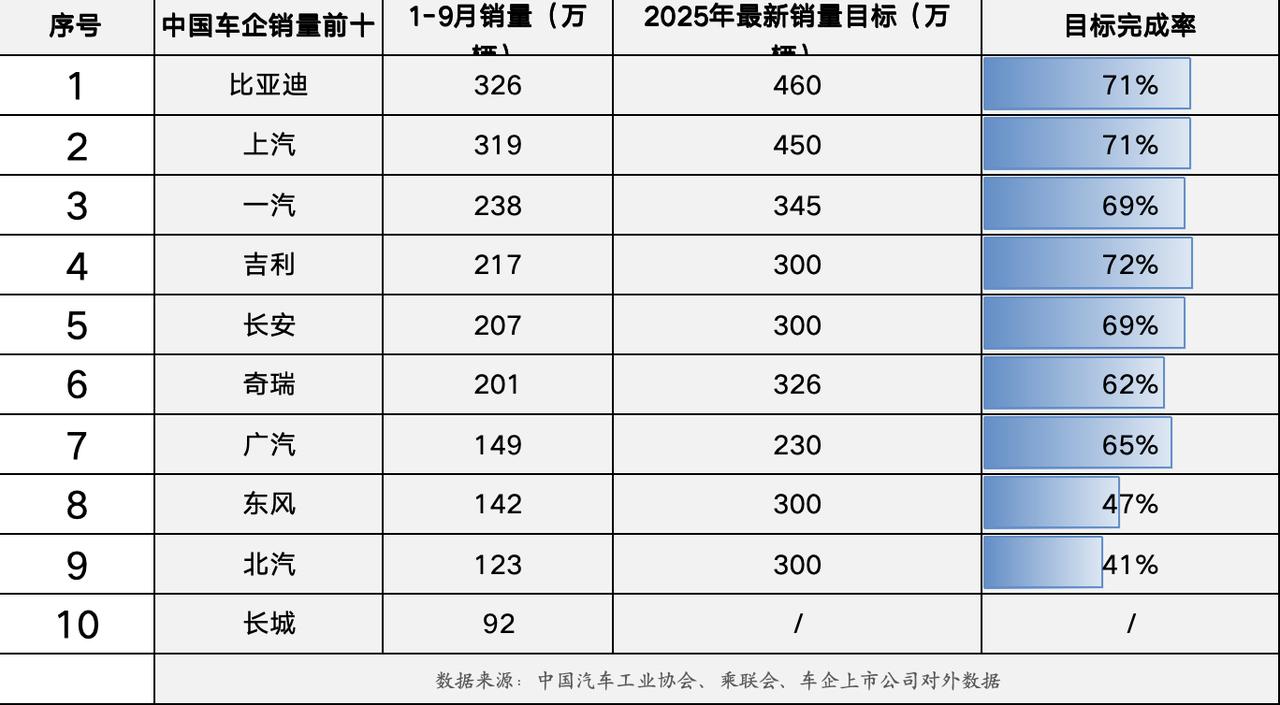 中国车企三大阵营格局初步形成,比亚迪依旧是双料冠军 2025年深秋,中国汽车行业迎来了一场没有硝烟的战争。 随着“金九银十”销售旺季的到来,各家车企纷纷亮出前三季度成绩单。这张成绩单背后,不仅关乎企业生死,更预示着中国汽车产业格局的重塑。 01 三国杀:三大阵营格局初定 中国车市正在形成清晰的三大阵营。 第一阵营是300万辆级别的两大巨头。比亚迪以326万辆的销量一骑绝尘,71%的目标完成率让其离全年460万辆的目标仅一步之遥。上汽集团以319.3万辆紧追不舍,这家老牌国企展现出惊人的转型韧性。 第二阵营是200万辆级别的诸侯混战。吉利汽车以217万辆的销量、72%的完成率成为“效率冠军”;一汽集团238万辆、长安汽车207万辆,双双完成69%的年度目标;奇瑞201万辆,广汽149.4万辆,这些车企正在为晋级第一阵营做最后冲刺。 第三阵营是100万辆级别的新势力与转型者,他们正在为生存而战。 这三个阵营的形成,标志着中国汽车产业进入深度整合期。 02 新能源:决定生死的分水岭 仔细研究这份成绩单,会发现一个惊人规律:完成率超过70%的三家企业,无一不是在新能源领域布局最深、转型最坚决的玩家。 比亚迪自不必说,其新能源基因已经深入骨髓。上汽集团虽然传统燃油车业务庞大,但在新能源领域的投入毫不手软。吉利汽车更是全面转型,新能源车型占比持续提升。 反观完成率相对落后的车企,大多在新能源转型上步伐较慢。当市场渗透率突破临界点后,传统燃油车的优势正在快速消退。 这是一个残酷的现实:得新能源者得天下,失新能源者失江山。 03 第四季度:决战时刻 “金九银十”不仅是一个销售概念,更是一个战略节点。 对于领先者而言,这是扩大优势的最佳时机。比亚迪正在全力冲刺460万辆年度目标,上汽也在为超越对手做最后努力。 对于追赶者而言,这是最后的机会窗口。长安、奇瑞、广汽等车企纷纷加大营销力度,试图在年终交出一份漂亮的成绩单。 对于落后者而言,这可能是生死存亡的关键一役。一些转型缓慢的车企,很可能在这个冬天被彻底淘汰。 04 全球视角下的中国车市 这场竞争的意义远超国内市场。 比亚迪正在向全球销量冠军发起冲击,上汽的海外布局日益深入,吉利、长安、奇瑞等车企也在加速出海。中国汽车不再满足于国内市场的主导地位,而是要在全球市场与老牌车企一较高下。 这种全球竞争力的背后,是中国汽车产业整体实力的提升。从技术研发到智能制造,从品牌建设到渠道拓展,中国车企正在各个维度缩小与国际巨头的差距。