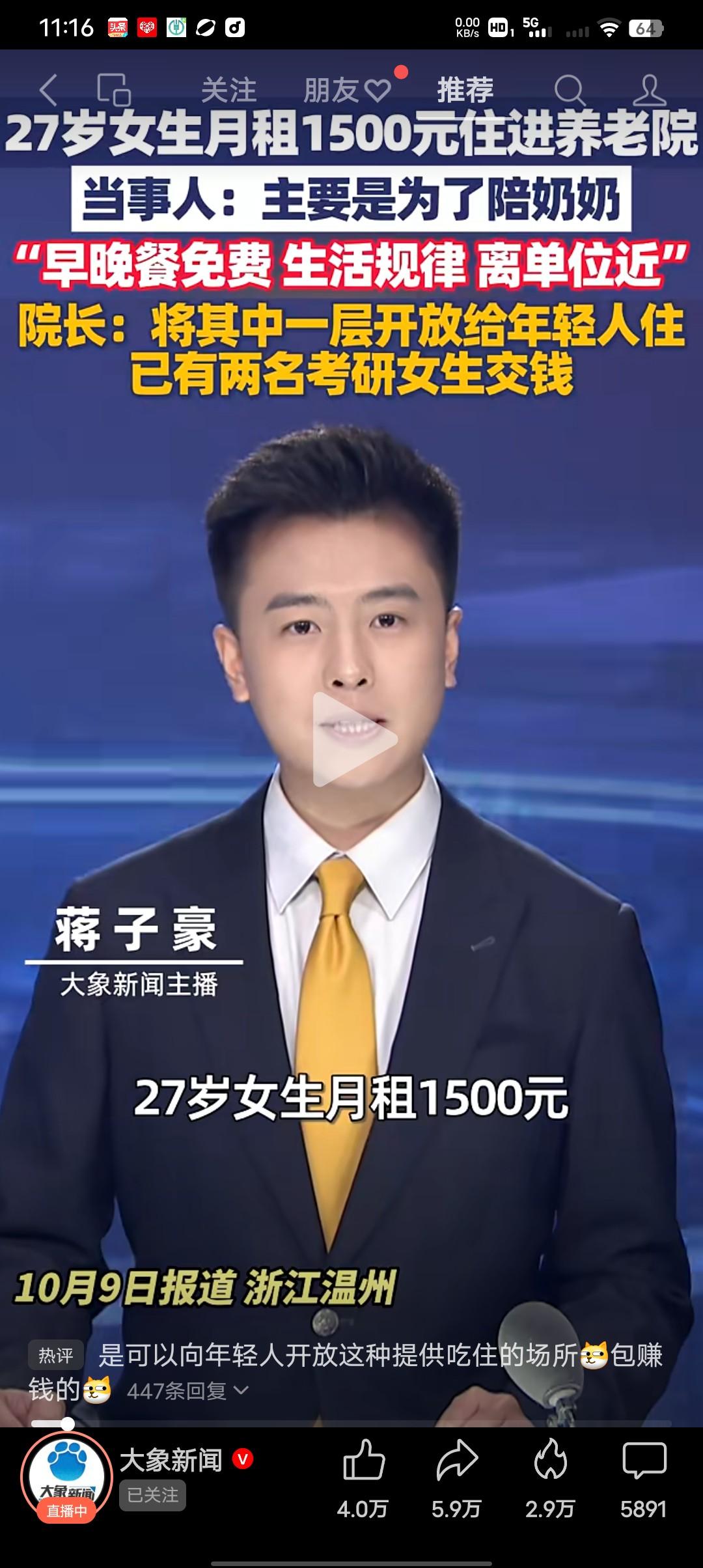 27岁浙江女生月租1500元住进养老院! 十月一号有网友分享,她跟奶奶住在养老院的的日常。当事人称:主要是为了方便陪伴奶奶,还有就是养老院的作息规律,再者就是离工作单位也很近,在养老院跟老人们近距离接触多了,感觉到了不一样的温暖,他们对我们年纪人都很好,年轻人能体会他们的不易,他们也能感受到年轻人的活力。 十月九号该园长证实:确是事实,养老院共六层,将其中一层开放,已有两名考研女生交钱准备入住。 这个举动好啊!让老年人的生活不再是沉闷,让年轻人也能感受到老一辈人的不易,简直是互补啊!我觉得这个一定要鼎力支持,黄昏跟清晨能相遇多美!希望晨曦的朝阳能照亮黄昏的美!您懂我的意思吗?希望这个养老院只是一个开始,后面还会不会其他养老院一并跟随效仿,既能照顾到年轻人创业时的窘迫,又能让老年人的晚年生活充满阳光!