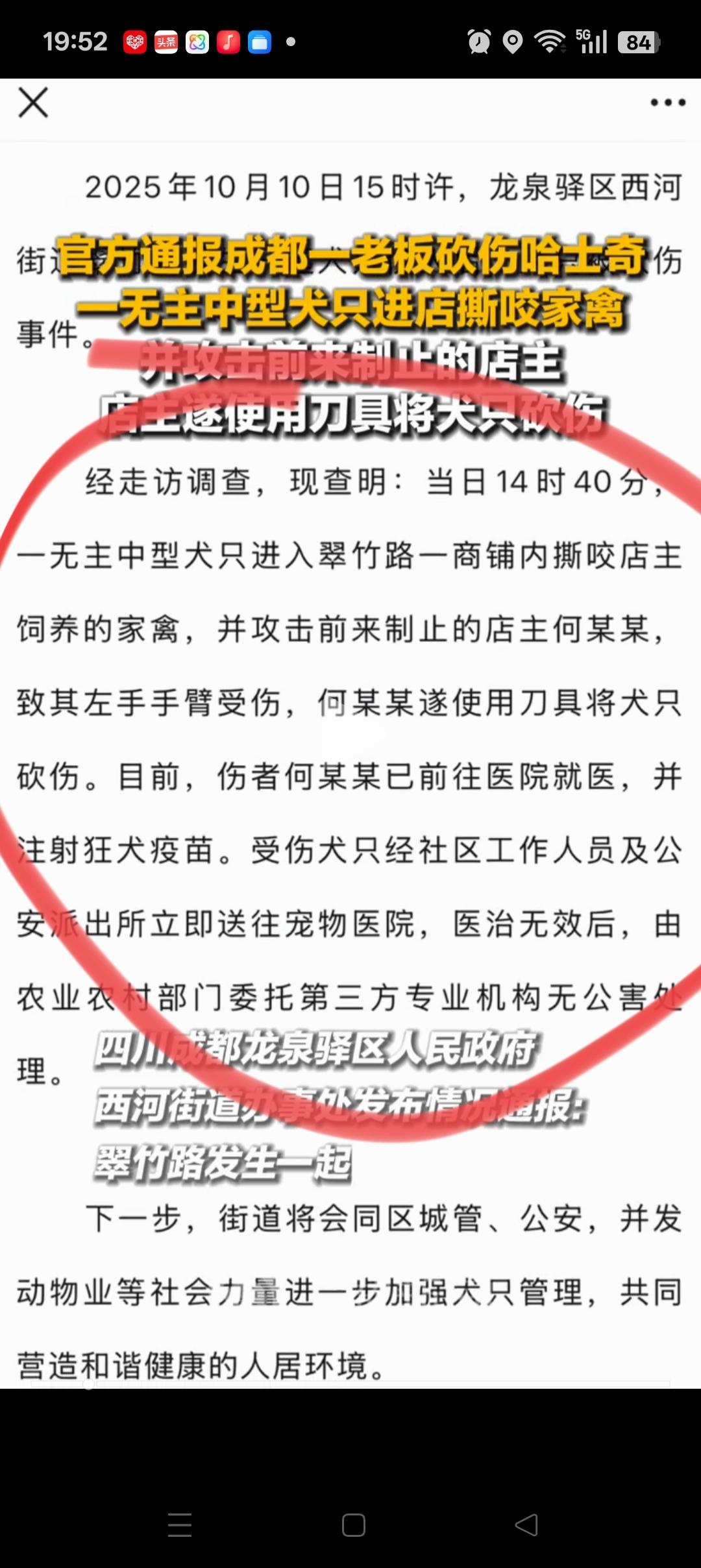 这些送花圈的人脑子有泡吧! 成都一流浪哈士奇被砍伤这件事, 明明是狗子先冲进店铺内咬了店老板养的鸡,后咬了他的手指,他才砍伤了狗,完全可以理解啊 这些送花圈的人,有一部分可能不了解事情经过,只看到结果,觉得狗子可怜,做出这种事还能理解 但现在官方已经澄清,确实是狗子的问题,还有人打电话骂店老板就过分了。 周边的商户也说了,这只狗4天前就到过她家门口,带了项圈,但找不到狗主人的信息,应该是走丢了。 讲道理,虽然狗主人下手有点重,但是送花圈的人也有点是非不分了吧!