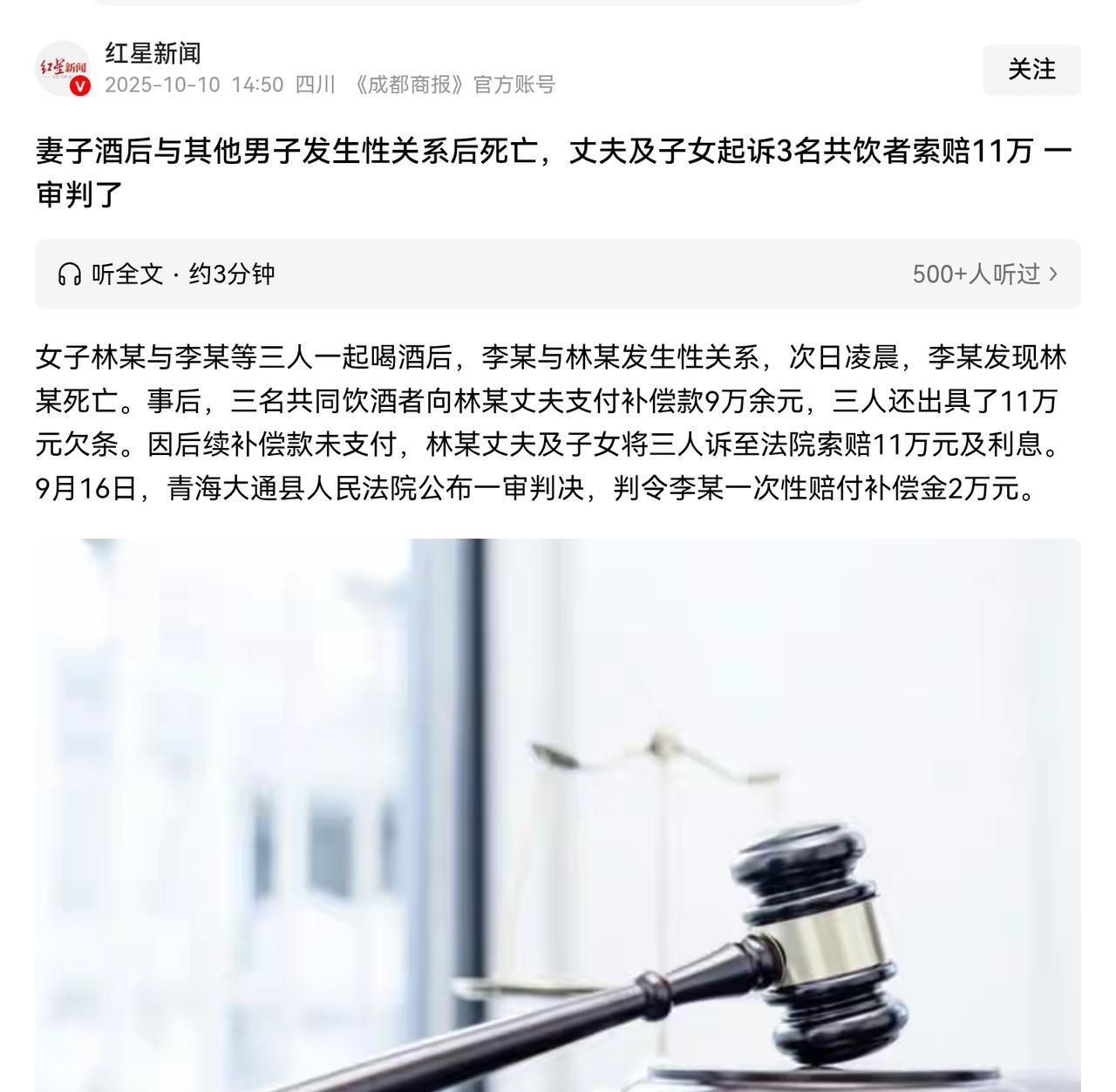 妻子酒后与其他男子发生性关系后死亡,丈夫及子女起诉3名共饮者索赔11万一审判了