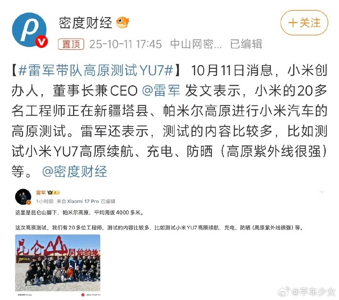 雷军带队高原测试YU7雷军亲自带队在帕米尔高原进行测试,有20多位工程师参与,测试内容包括高原续航、充电性能和防晒能力(特别是针对高原紫外线)。测试地点在新疆塔县,平均海拔4000多米,环境也非常严苛。