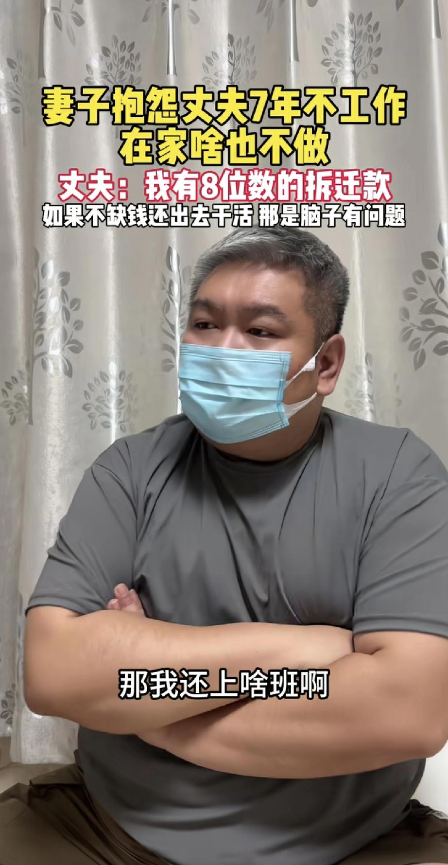最近有对夫妻的对话挺有意思。妻子抱怨丈夫七年不工作,整天待在家里。没想到丈夫理直气壮地说:“我有八位数的拆迁款啊!这条件还出去干活,不是脑子有问题吗?” 这话一出,不少网友都笑了。有人说:“我要有这么多钱,我也躺平了。”还有人调侃:“终于找到我不想上班的真正原因了!” 不过玩笑归玩笑,家里有矿固然幸运,但生活还是需要点目标和动力的。要是你也有八位数存款,你会选择继续工作还是在家休息呢?