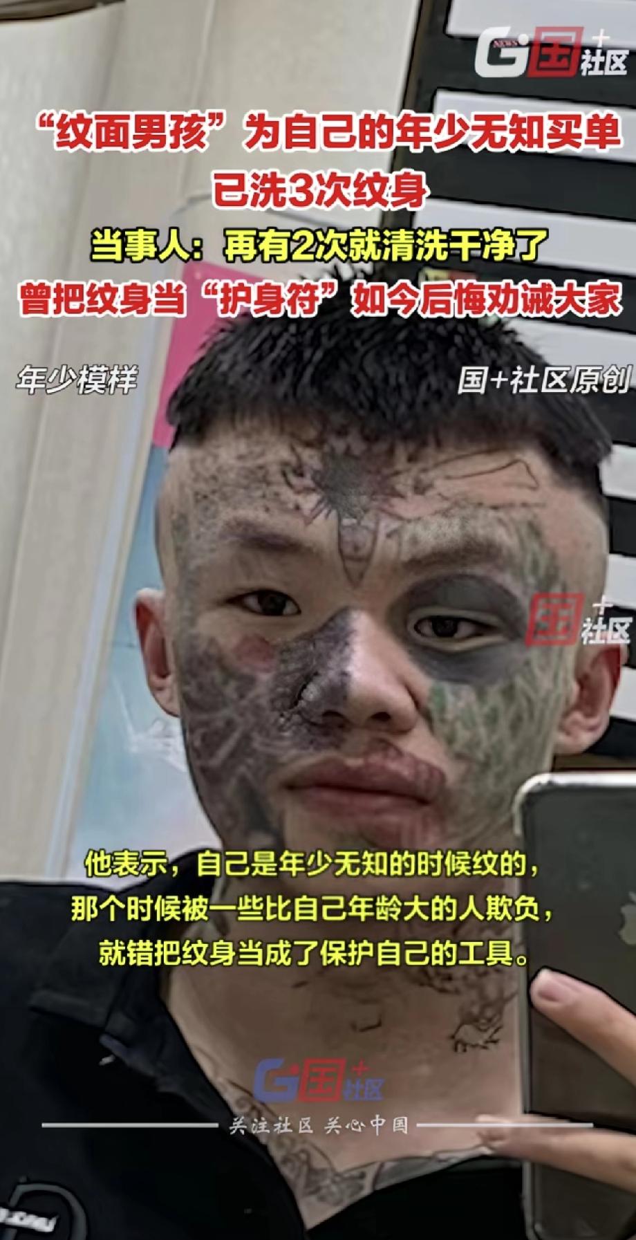 年轻时以为纹身是“护身符”,能吓退欺负自己的人,如今却要为此付出代价。这位“纹面男孩”正在为年少的决定买单。 他已经洗了三次纹身,每次都很痛苦。他说大概再洗两次就能彻底干净了。回想当初,他后悔地说,那会儿真是年纪小不懂事。 现在他想用自己的经历提醒大家:纹身前一定要三思,别像他一样,等后悔了再花时间花钱又受罪地去清洗。有些决定,真的会影响很久。