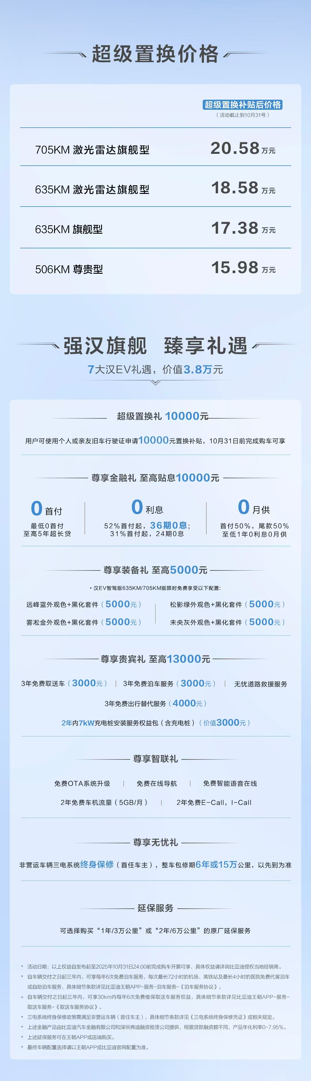 比亚迪为车主准备了专属服务权益,尊享取送车服务、泊车服务覆盖高铁站、机场、医院三大场景,且全部免费。针对汉DM-i将推送油耗OTA,百公里亏电油耗降至3.35升。汉EV 506KM尊贵型推出金秋限时礼遇,惊喜价15.98万元!