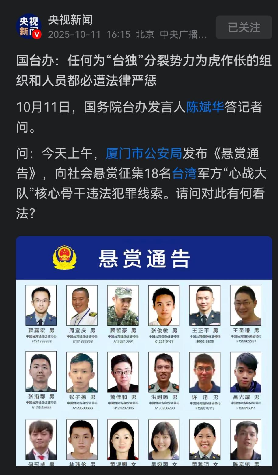 再也不用来什么遮遮掩掩了! 央视直接公布了台湾所谓的“心理站大队”的悬赏通告,连他们的身份证的号码都写的明明白白。而且是由厦门公安部门来负责! 这些所谓心理战大队,在台湾愚弄我们的同胞,长期策划和煽动分裂国家的行动,就应该把这些台毒分子,全部给抓起来!