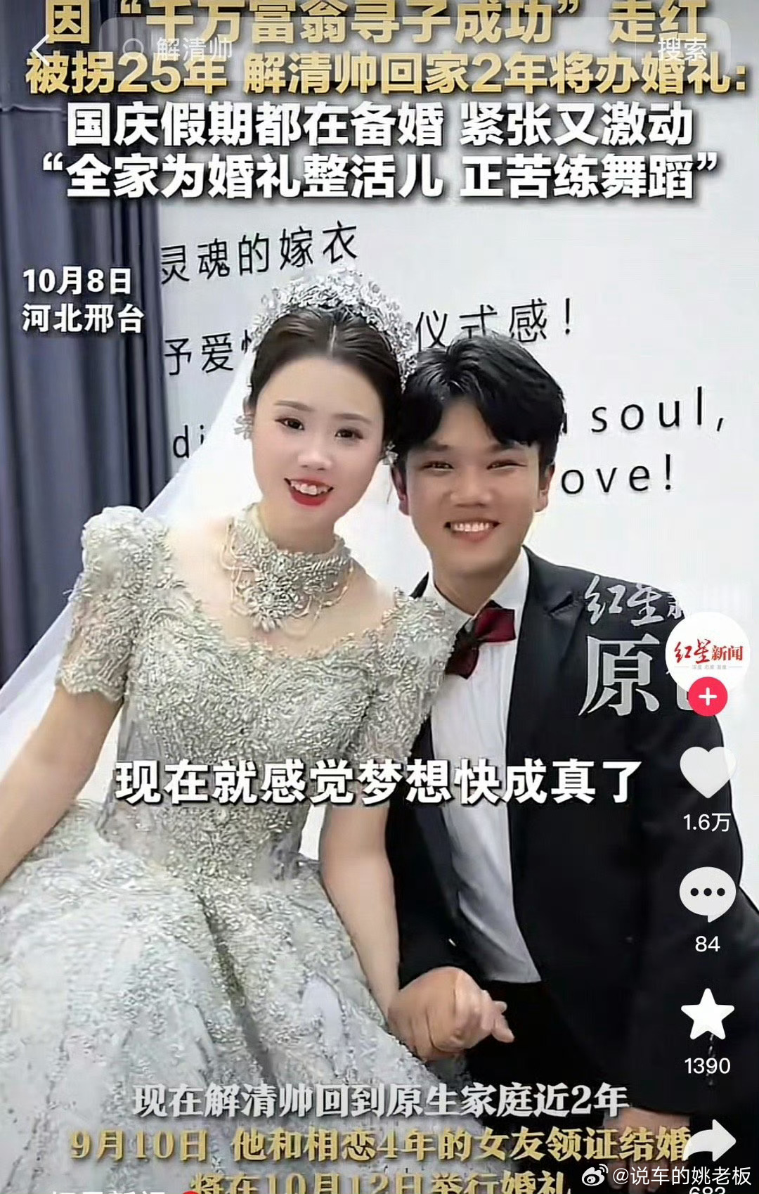 千万富翁给丢失25年儿子婚礼办40桌有人说解清帅不算传统意义上的“帅”,当年家里