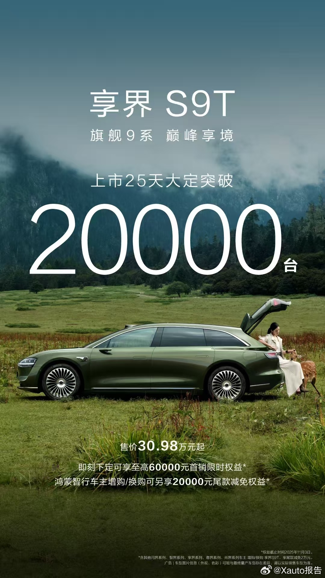 10月11日,据享界汽车官方消息,享界S9T上市25天大定破20000台,创下旅行车市场销量记录。
