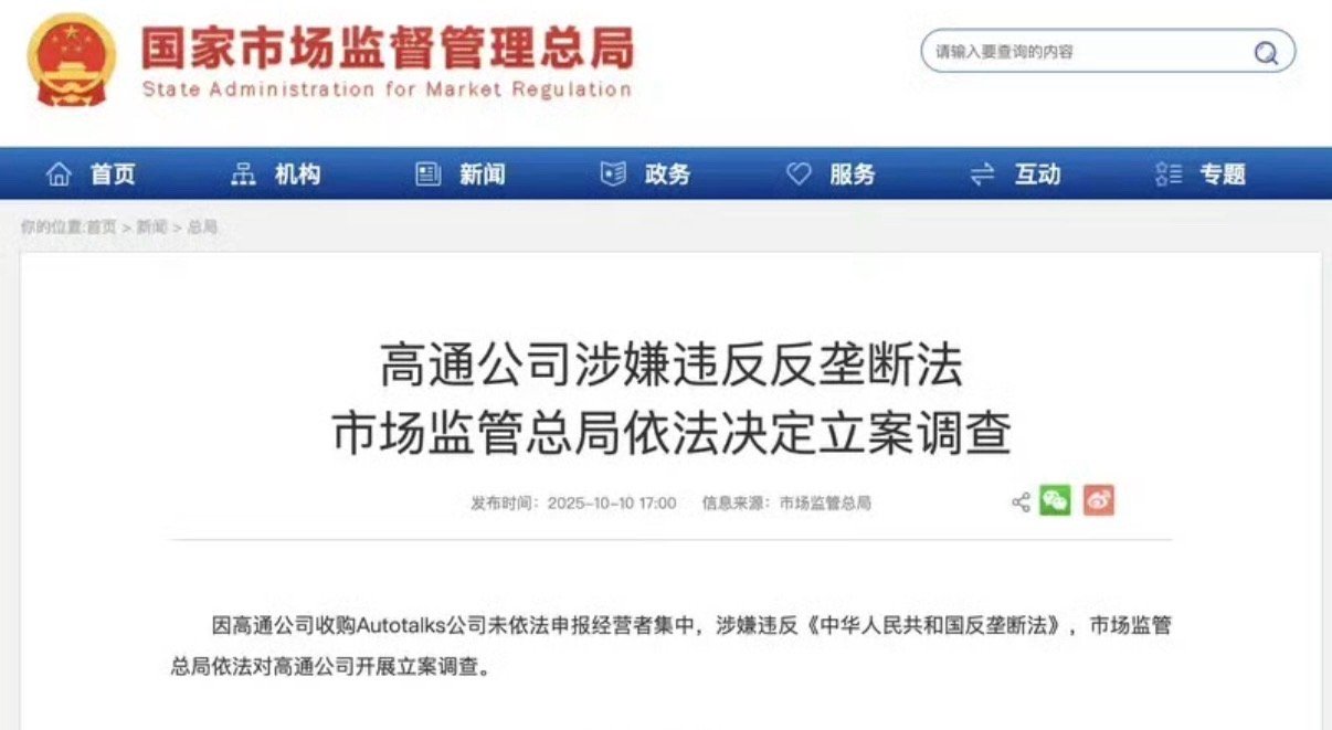 【市场监管总局:高通公司涉嫌违反反垄断法依法决定立案调查】10月10日,国家市场
