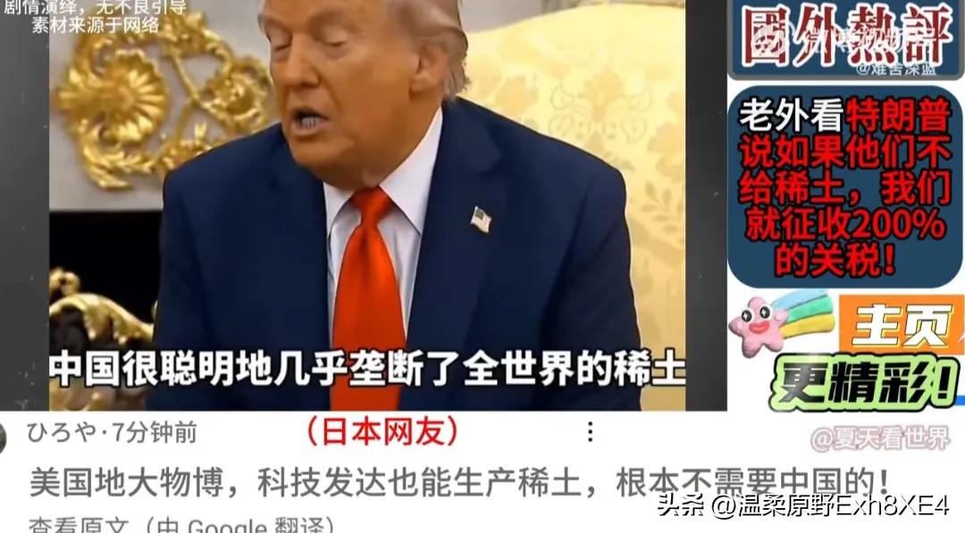 又反转!就在刚才,特朗普:“如果他们(中国)不给稀土,那么我们就必须对他们征收200%的关税!中国很聪明地几乎垄断了全世界的稀土,以前根本没人需要稀土” 外网评论A:卖给你们稀土造飞机、造枪、造炮,然后打中国吗?中国不傻! 外网评论B:美国地大物博,科技发达也能生产稀土,根本不需要中国的! 不知道是不是因为没得到和平奖,川普的表情还有点小委屈,又在那放嘴炮。你想加就加呗,市场我们有的是,不差你这点! 不过买美股的朋友得注意了,别被这老登给套进去了