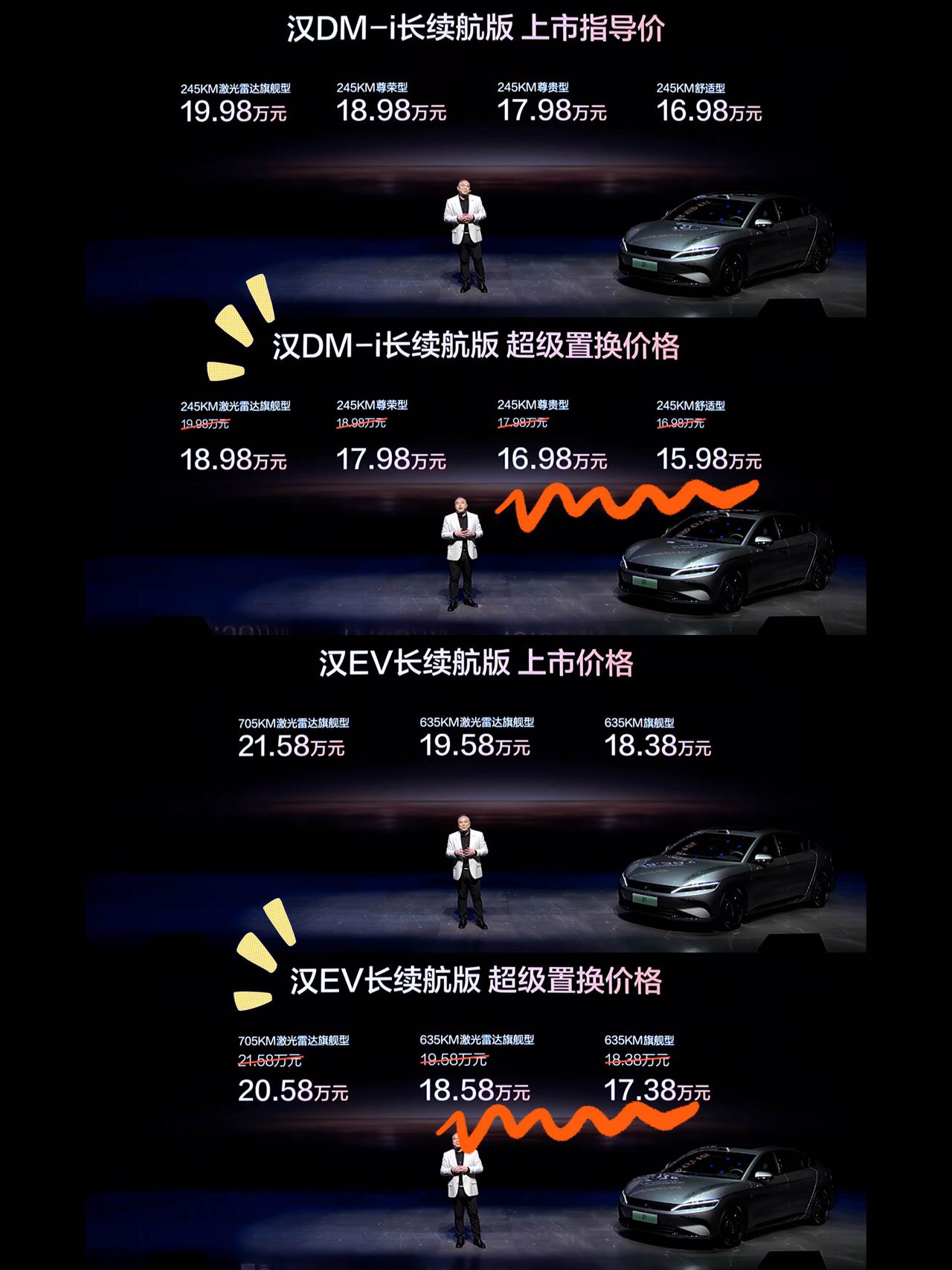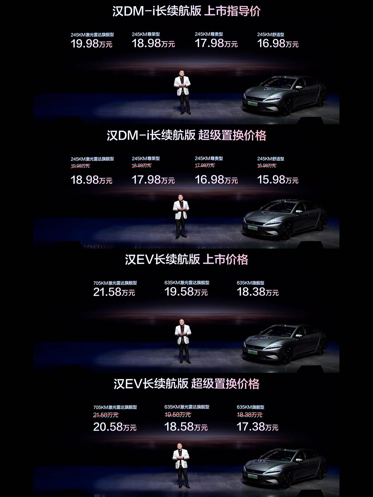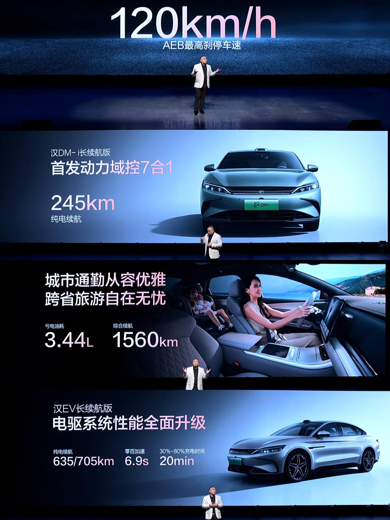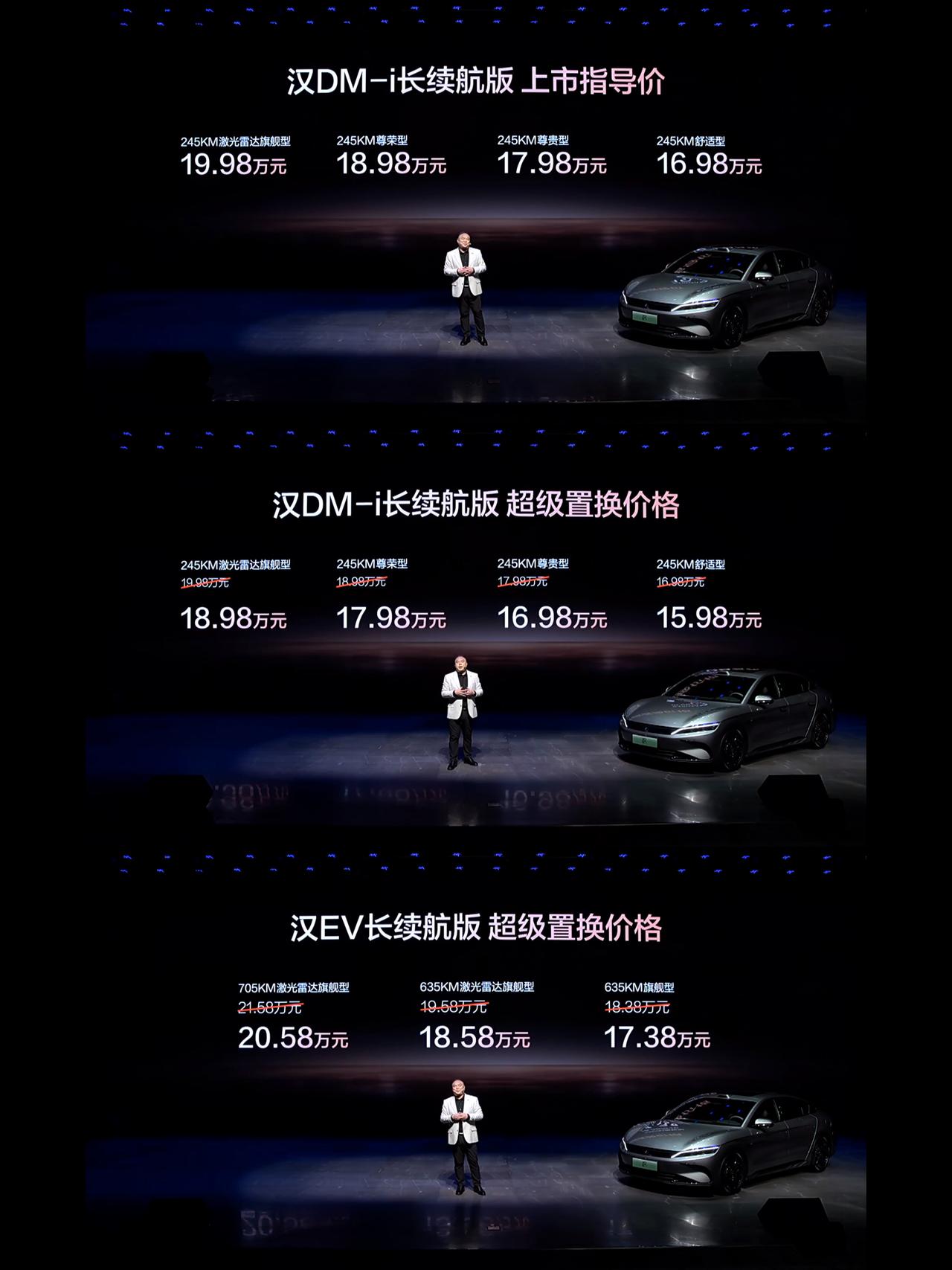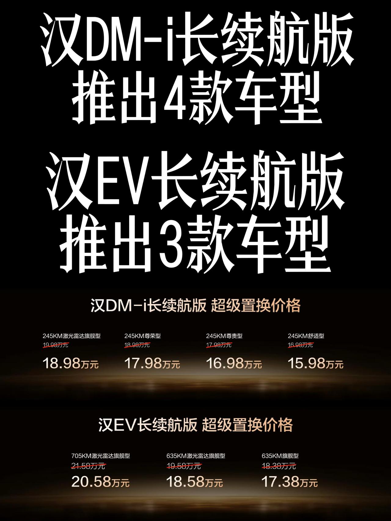 比亚迪汉长续航版正式上市了,新车老规矩分为了DM-i以及EV版本。 汉DM-i长续航版共推出4款车型,补贴后售价15.98万~18.98万元;汉EV长续航版共推出3款车型,补贴后售价17.38万~20.58万元,不得不说这个价格非常的有惊喜,毕竟这可是比亚迪王朝系列最高旗舰车型,都已经卷到EV版本这个价格不到21万了~ 来看一下这次的长续航版本,除了在纯电续航起步635公里,最高705公里外,还有哪些比较惊喜的表现? 1,汉DM-i长续航版全系标配都会搭载第五代DM技术,首发动力域控7合1系统,纯电续航达到245公里 百公里的油耗3.44L,综合续航跑进1560km综合续航里程 2,百公里加速最快6.9秒 3,长续航版还特别推出雾凇金、松影绿、远峰蓝三大全新车色,这三个颜色相对会比较低调,但也透露着旗舰车型的那种低调奢华的感觉 4,新车全系升级电子怀挡 5,座舱的用料上,副仪表台增加了激光拉丝面板;副驾台配备耐脏易打理的皮质材料 6,4.5升容积的智能冷暖冰箱,支持-6℃至50℃宽温域调节 7,ANC主动降噪技术配合双层隔音玻璃 8,还有特别开发的智能防晕车系统 9,搭载同级领先的DiLink 100智能座舱高阶版,接入Deepseek大模型,新增手车互联、无麦K歌等功能 10,和方程豹钛7一样,这次汉长续航版本耶新增了合作商模式,好孩子智能儿童安全座椅、宠物安全座、倍轻松智能眼罩及影石Insta360运动相机等深度联动,只要蓝牙连了车机,就可以随时在车上去体验这些,之前在静态体验方程豹钛7的时候也和大家着重讲过,感兴趣的小伙伴可以去翻阅一下 11,在技术层面,这次必然也会有云辇-C智能阻尼车身控制系统,主动预瞄功能;智能泊车辅助系统现支持超过300种泊车场景 12,标配TBC高速爆胎稳行系统,当车辆在高速(至高190km/h)行驶过程中爆胎时,爆胎专属硬件会毫秒级响应 13,而且作为比亚迪王朝的旗舰车型呢,这次比亚迪还有专属服务权益:尊享取送车服务让汉车主无需亲自到店,可享专人取车到店和送车到家服务。同时,汉车主尊享泊车服务已覆盖高铁站、机场、医院三大场景,让用户停车就走,有专人帮助停车及送车,就算不算比亚迪汉的一个全新的突破模式 虽然很多人都会说当前比亚迪很多车型都会略有同质化,但换一个角度看,车型的同一性,甚至可以让很多性价比的车也拥有高端的配置,让不同级别的用户都可以同时享用到比亚迪更加优质且全面的,这件事情肯定是对于用户来说需要点赞的,而这次比亚迪汉车型的长续航版本,不仅在里程焦虑问题上,更加新增了很多在做智能互动上面的功能,而是比亚迪越来越用户声音,去做到更年轻化的一个表现吧~ 比亚迪汉EV 比亚迪汉车系 比亚迪汉DM 汉 比亚迪