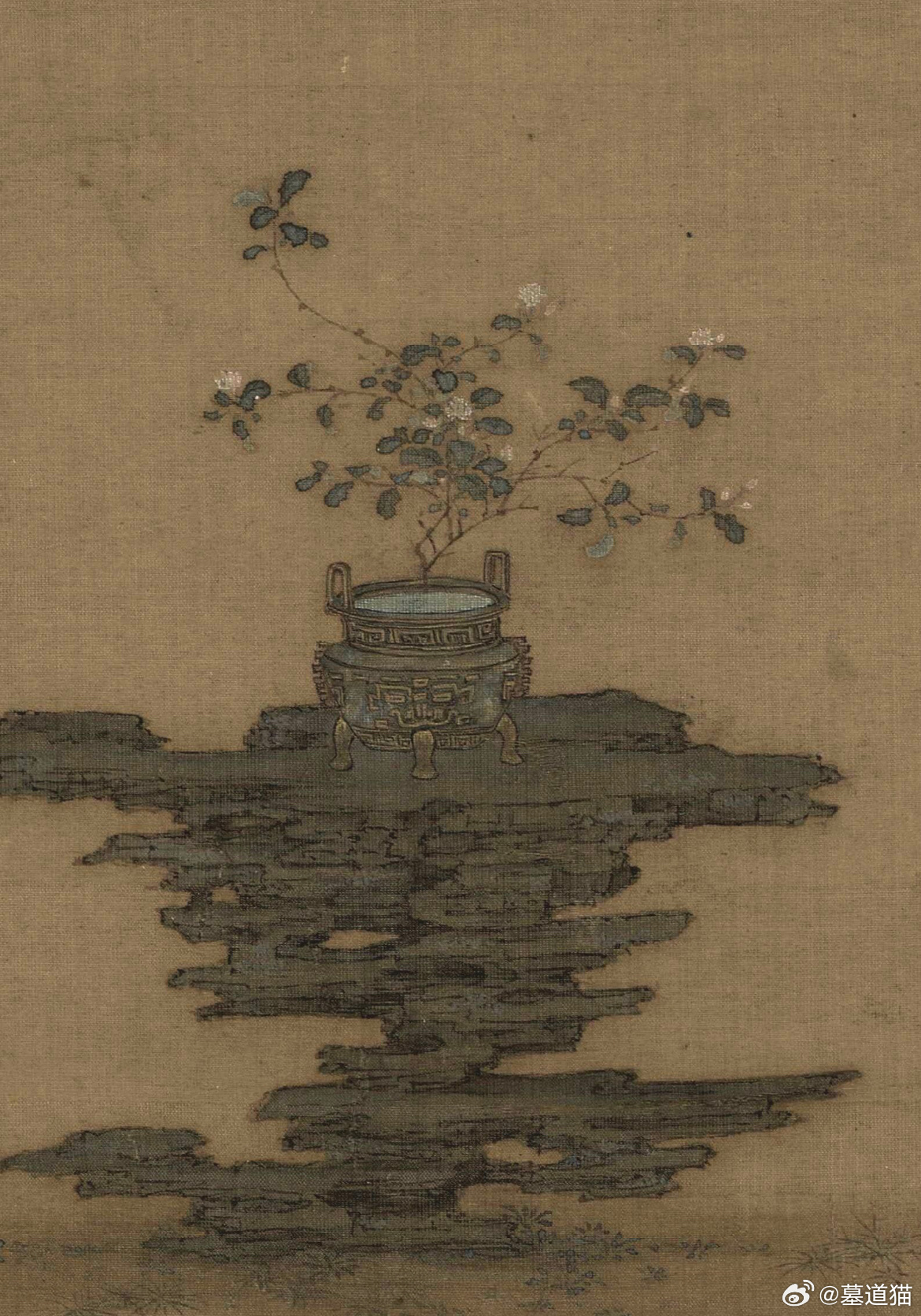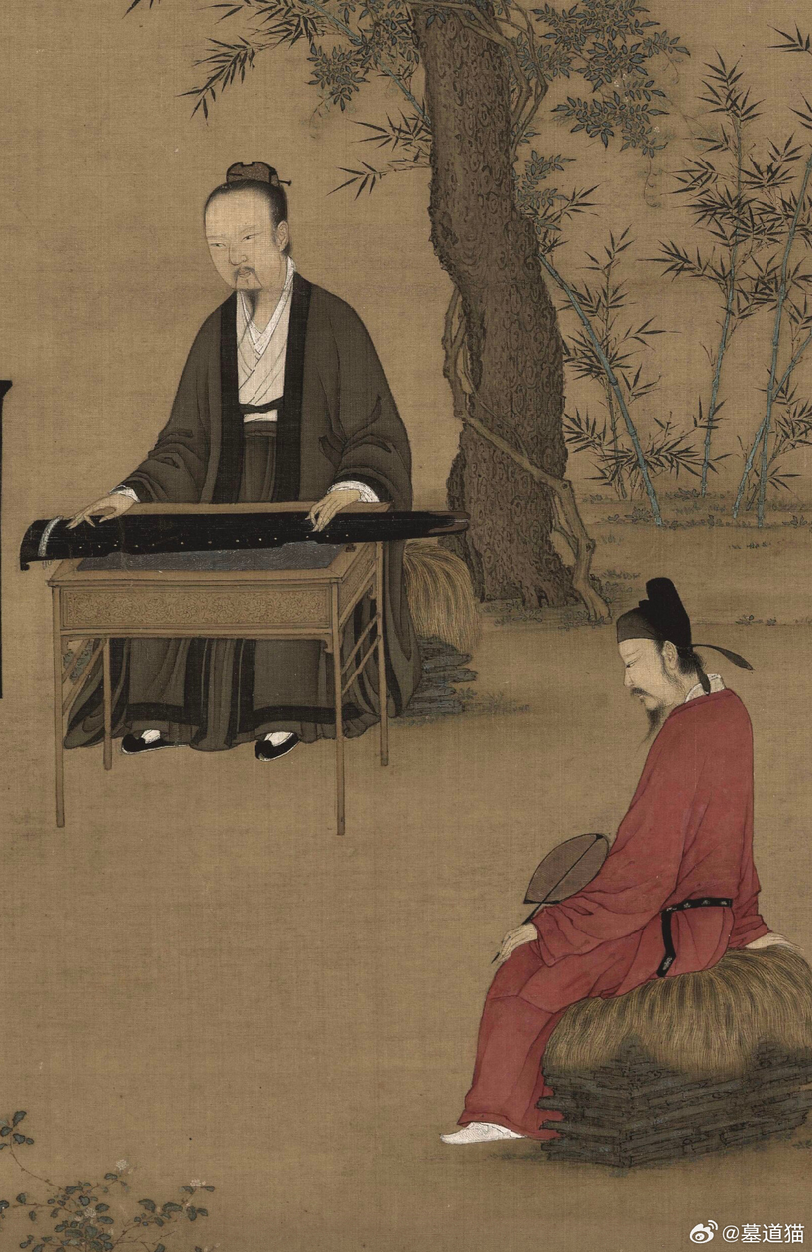 此幅描绘官僚贵族雅集听琴的场景。主人公道冠玄袍,居中端坐,凝神抚琴,前面坐墩上两位纱帽官服的朝士对坐聆听,左面绿袍者笼袖仰面,右面红袍者持扇低首,二人悠然入定,仿佛正被这鼓动的琴弦撩动着神思,完全陶醉在琴声之中。叉手侍立的蓝衫童子则瞪大眼睛,注视着拨弄琴弦的主人公。作者以琴声为主题,巧妙地用笔墨刻画出“此时无声胜有声”的音乐的意境。画面背景简洁,如盖的青松和摇曳的绿竹衬托出庭园高雅脱俗的环境,而几案上香烟袅袅的薰炉与玲珑石上栽植着异卉的古鼎与优雅琴声一道,营造出一种清幽的氛围。