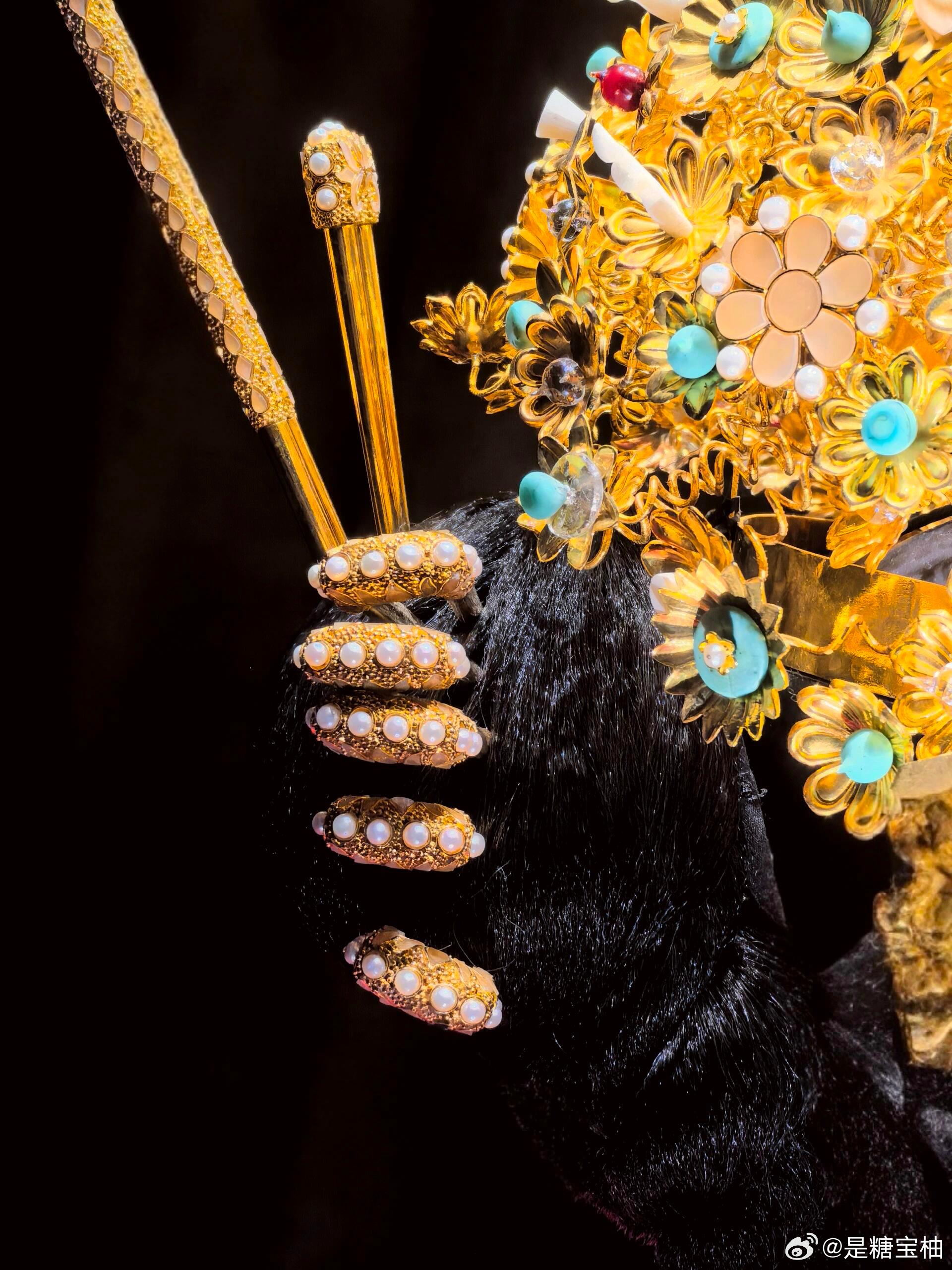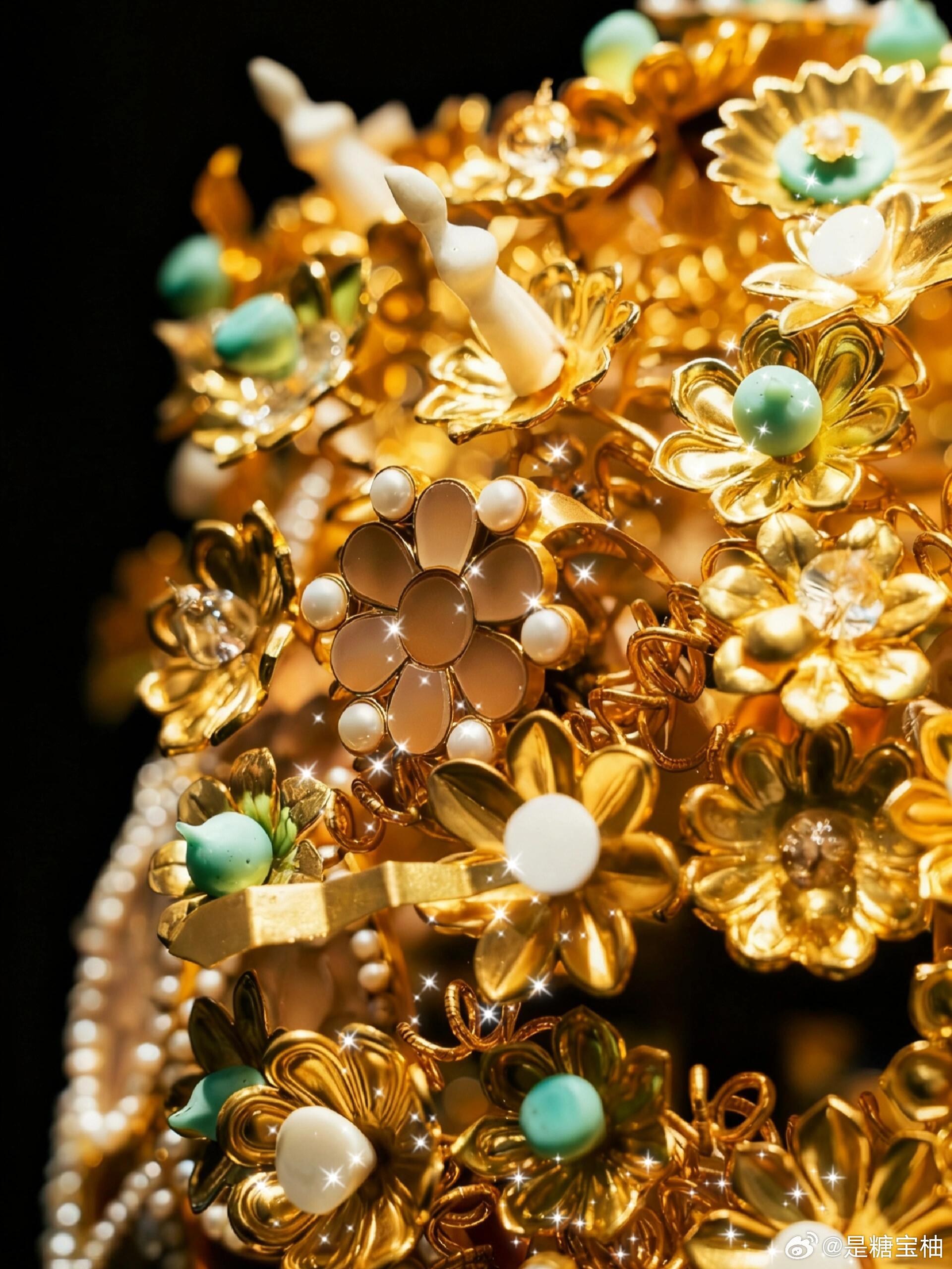 最特别的是冠上13棵“宝石花树”🌸。每棵花树以12根螺旋状金丝环绕主枝,风拂过时似在轻轻晃动,灵动至极;玻璃花蕊、圆润珍珠、温润玉石的搭配,让色彩层次格外丰富;花树与发钗的连接设计巧妙,既稳固又不会过于沉重,尽显古人手艺的精湛。