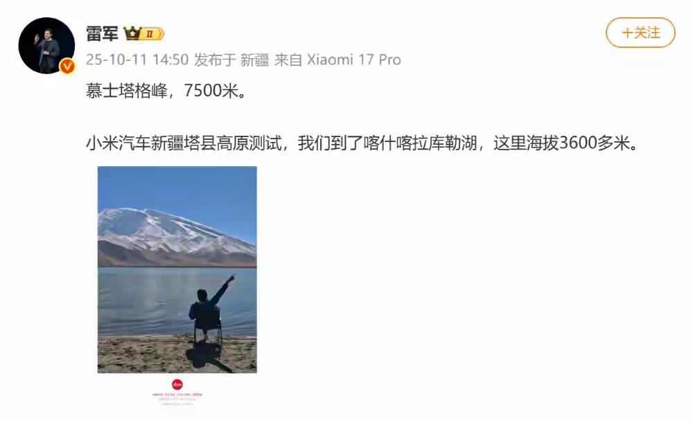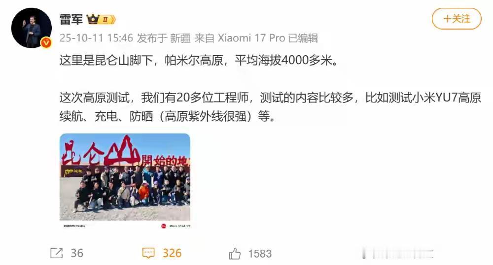 小米第三款车的消息太让人兴奋啦!10月11日网上曝光了疑似小米YU9在新疆测试的视频,画面里三辆疑似小米YU9编队行驶,最后那辆车伪装车贴上编号是041,背景还有雪山,超有感觉。 当天下午雷军在社交媒体发文,说自己到新疆塔县进行小米汽车高原测试,网友纷纷猜测他是来亲自测第三款车的。而且小米汽车高级顾问胡峥楠等多位高管IP属地都显示在新疆,看来很多高管都参与了这次测试。之前小米SU7和小米YU7发布前,雷军等高管也路测过新车,这么看小米YU9估计很快就要和大家见面咯! 雷军胡峥楠亲赴新疆试车,谍照曝光!小米第三款车YU9剑指高端SUV市场 2025年10月,新疆昆仑山脉的高原路况迎来了特殊的测试者——小米汽车的第三款车型测试车队。三辆贴满伪装车贴的测试车在雪山间穿梭,雷军、胡峥楠等核心高管的集体现身,让这款暂称YU9的新车成为舆论焦点。从谍照细节到动力配置,小米在SUV赛道的旗舰野心正逐渐清晰。 高管亲赴测试场的举动,凸显了这款车的战略分量。雷军在社交平台透露,此次新疆测试将覆盖四至五千米高原区域,重点验证车辆在极端环境下的性能稳定性。而胡峥楠作为小米汽车核心技术负责人同行,暗示新车或搭载多项技术突破。网友拍摄的谍照显示,测试车车身编号为041,车顶凸起的激光雷达装置格外醒目,印证其高端智驾配置的定位。 外观设计上,YU9跳出了SU7和YU7的运动化框架,以5.3米的车长跻身全尺寸SUV行列。平直的腰线从前翼子板延伸至车尾,后窗线条与尾窗流畅衔接,搭配高耸的车头造型,营造出类似劳斯莱斯库里南的稳重气场[__LINK_ICON]。家族式尾灯的凹凸造型赋予车尾层次感,无边框水滴型后视镜则保留了科技基因,与伪装下的硬朗轮廓形成巧妙平衡。 动力系统的选择堪称精准卡位。与前两款车型的纯电路线不同,YU9采用增程动力,预计搭载东安动力1.5T增程器,匹配前后双电机四驱系统,综合功率超400马力[__LINK_ICON]。这套组合带来的核心优势是续航突破:CLTC纯电续航超200km,满油满电综合续航可达1500km,配合800V高压快充,15分钟即可补充300km续航,彻底解决长途出行焦虑[__LINK_ICON]。 空间与配置的升级直击家庭用户需求。新车将提供2+2+2六座与2+3+2七座两种布局,填补小米此前在多座车型市场的空白。内饰预计延续SU7的科技风格,配备可旋转中控屏与全液晶仪表,搭载澎湃OS系统实现小米生态无缝衔接。后轮转向系统的加入,更让这台5米级大车保持了灵活的驾驶体验[__LINK_ICON]。 市场定位上,YU9显然瞄准了理想L9、问界M9占据的高端SUV市场。参考小米“高配低价”的一贯策略,新车售价或低于竞品,以性价比优势撕开市场缺口。从纯电轿跑SU7到家用轿跑YU7,再到全尺寸增程SUV YU9,小米在一年内完成主流细分市场覆盖,构建起“纯电+增程”的产品矩阵[__LINK_ICON]。 随着新疆测试的推进,YU9距离正式亮相已越来越近。这款集长续航、大空间、高智能于一身的旗舰SUV,不仅是小米汽车的战略补位之作,更将搅动高端新能源SUV市场的现有格局。雷军此次亲赴高原督战,无疑是对这款新车寄予厚望,而市场能否再现“SU7式”的爆款奇迹,值得拭目以待。