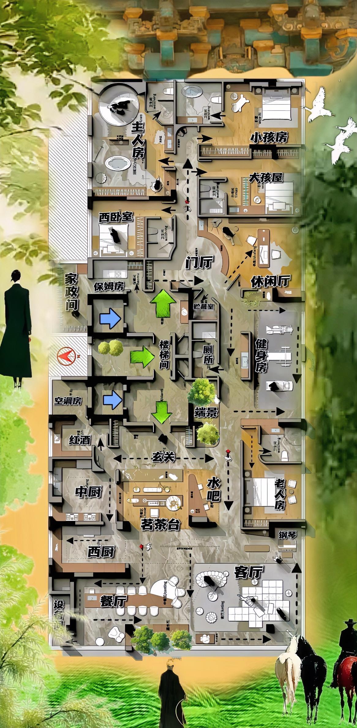 好漂亮,看来495㎡背景板,才是给人一场视觉盛宴,它没活在美颜里,活在妙笔生花的布局中,动区多元,静区细腻,大运动区,做家人们就交平台! 双景观,造景。三玄关,分摊公能区。四闲厅,细化生活方式。尤其是正常玄关,别看没墙没柜无收纳,别笑话,凭借三米半茶台出圈,它能hold全场的气氛,可是百平大厅的永远白月光! 真的很好磕cp,集水吧,酒吧,茶台三合一的茶歇区! 与餐食区相连,与客厅做邻居,构成双重通廓,反正就是以客厅为中枢,吃的中岛组合餐厅,喝的以茶台组合饮品区,玩的以钢琴为主题的游乐区,大概是见过最璀璨的动区! 大运动区,居中,布局是一个好控制的好平台,最先上岸的功能区,只有三个搭子,搭子一,收纳藏设备,搭子二,厕所很方便。搭子三,水吧加氧气。 见过最简洁的私人动感健身房!气氛组是九米落地窗,阳光不够,风景来补! 你是最安静的私区,五间卧室半边楼, 满层开放式书房,全屋尽是读书人,最搭的布局设计,满足私区的生活需求,翻本书,喝口水,不用走五十步到厨房,也不用打发半小时,再走六十步到客厅,真正实现私区的事,决不麻烦在公区办! 反正是,公区布局很,搭配有手段。私区动线,很合理。运动区的,也超前。 特别的一亩大平层,用心的搭,我就要用心的夸!犹如我观蜉蝣一日游,犹如宇宙观我一生! 超前谋划大户型,请再等一世吧!