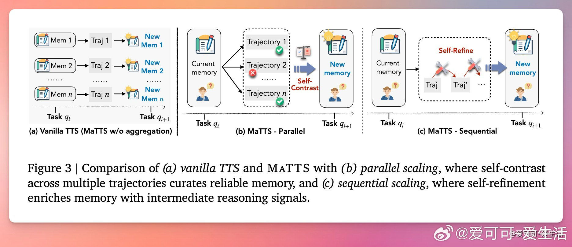 核心机制是:任务前通过语义检索调用相关经验,任务后由另一个模型判断成败并提炼教训,系统合并优化记忆,避免冗余。配合MaTTS测试时刻扩展技术,进行多次并行或逐步自我优化,显著提升推理准确率和效率。