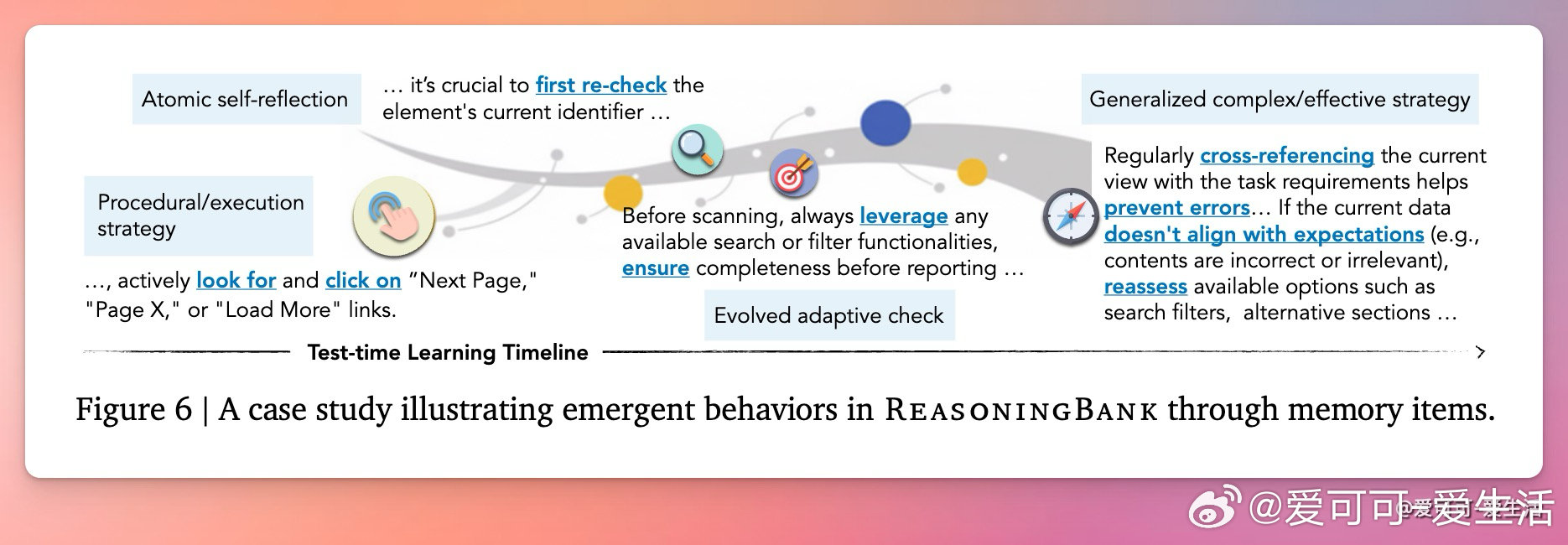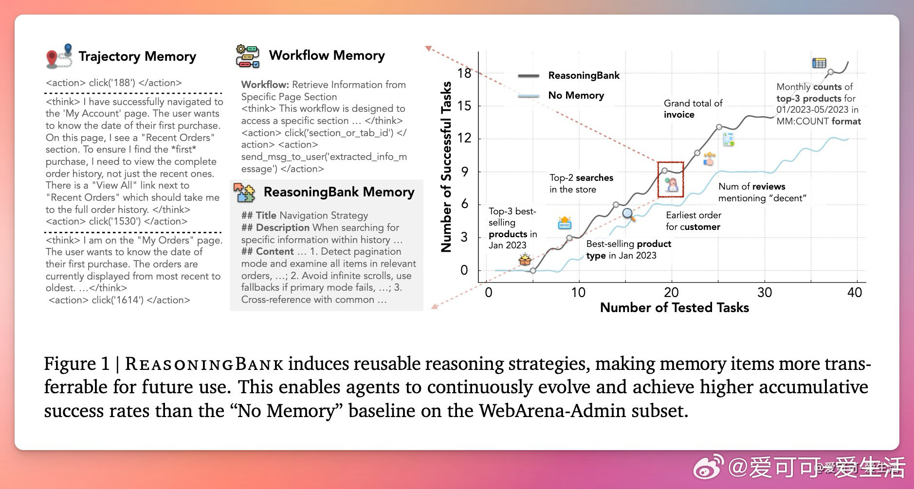 更重要的是,ReasoningBank不仅记忆“发生了什么”,更注重“为什么成功或失败”,真正实现经验的普适化和策略化。失败不再是噪声,而是宝贵资源。
