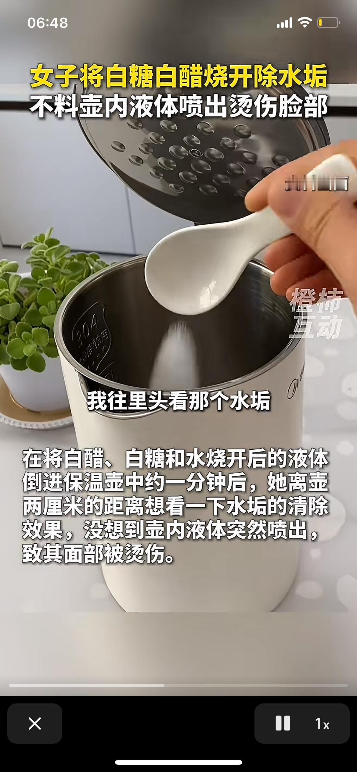 女子用白糖白醋除水垢,结果液体喷脸上烫伤!这偏方用的时候可得小心了。 本想着省钱除水垢,没想到弄出这糟心事儿。化学老师说了,白糖加白醋煮沸后得静置5分钟冷却,不然生成气体快了就会沸水喷出。 这也提醒咱们,偏方虽好,但操作步骤得搞清楚,别光顾着省钱忽略了安全。 你们还知道哪些实用但得注意安全的生活小妙招?来评论区聊聊,咱们一起避坑!
