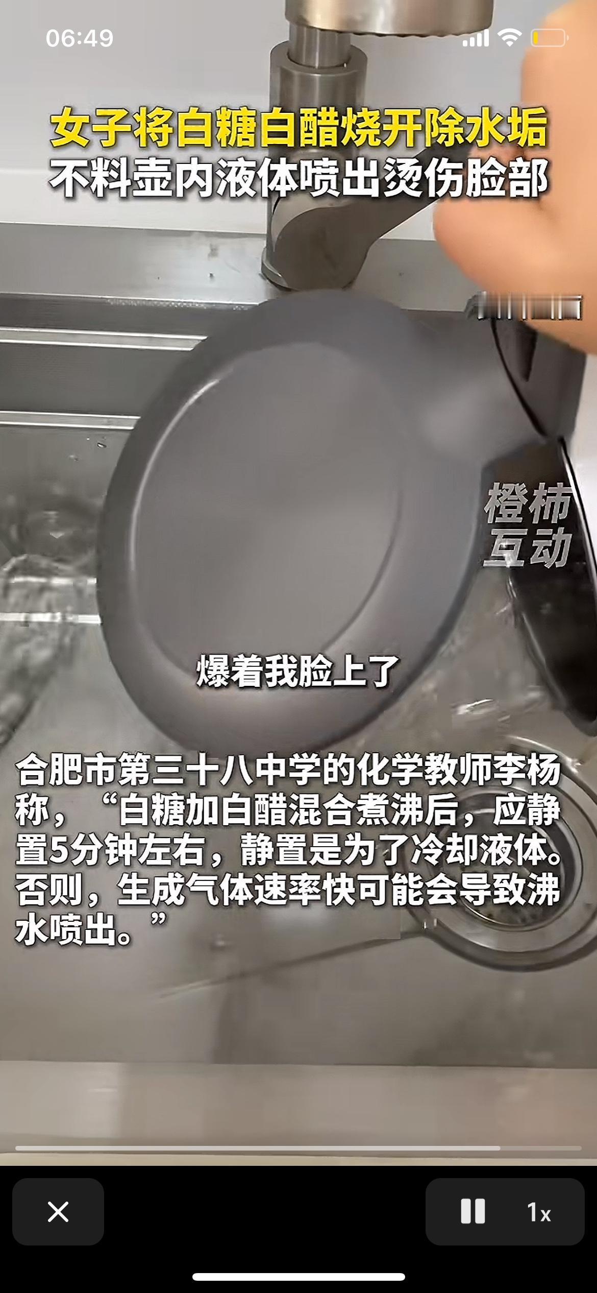女子用白糖白醋除水垢,结果液体喷脸上烫伤!这偏方用的时候可得小心了。 本想着省