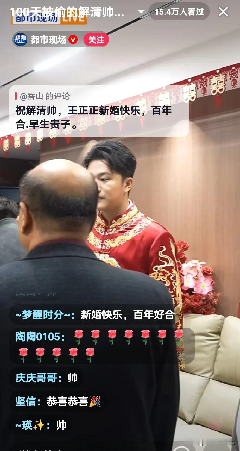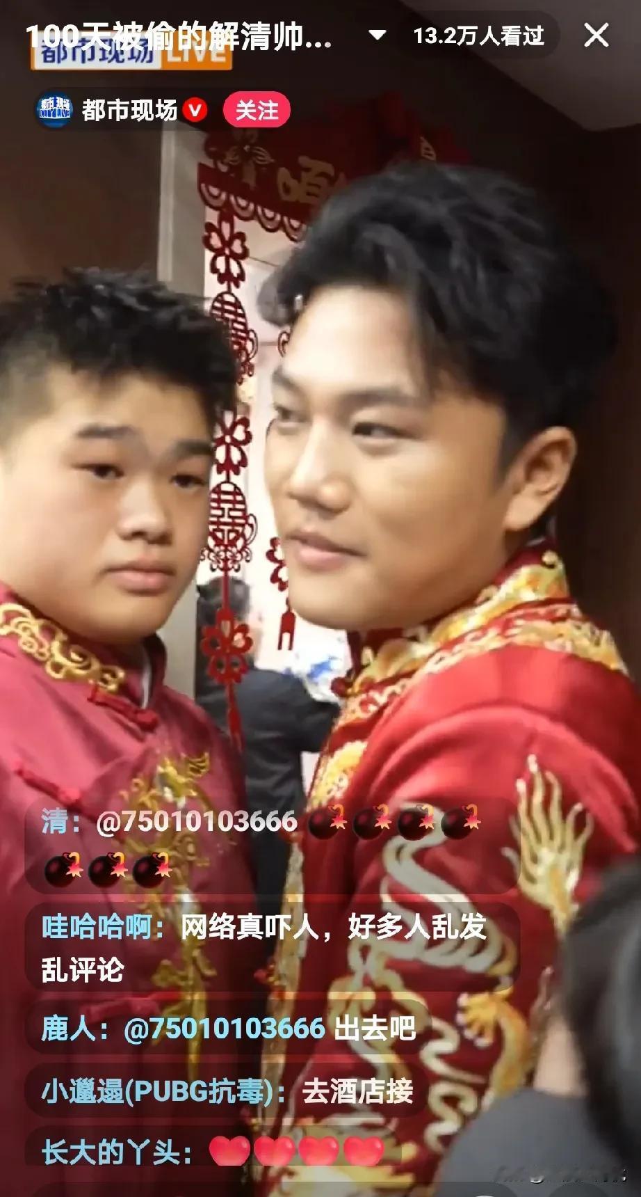 解清帅说会在今天早上7:00准时给大家开播,还给大家准备了喜糖, 我等了半天也没有看到他开播, 然后我就刷到了一个自称是都市记者在全程直播解清帅的婚礼, 看看吧,都市都在报道解清帅, 这个记者还说有很多网友都在外面开播解清帅的婚礼,而且还胡思乱语, 说解清帅是一个挺正能量,挺眼光的一个孩子,