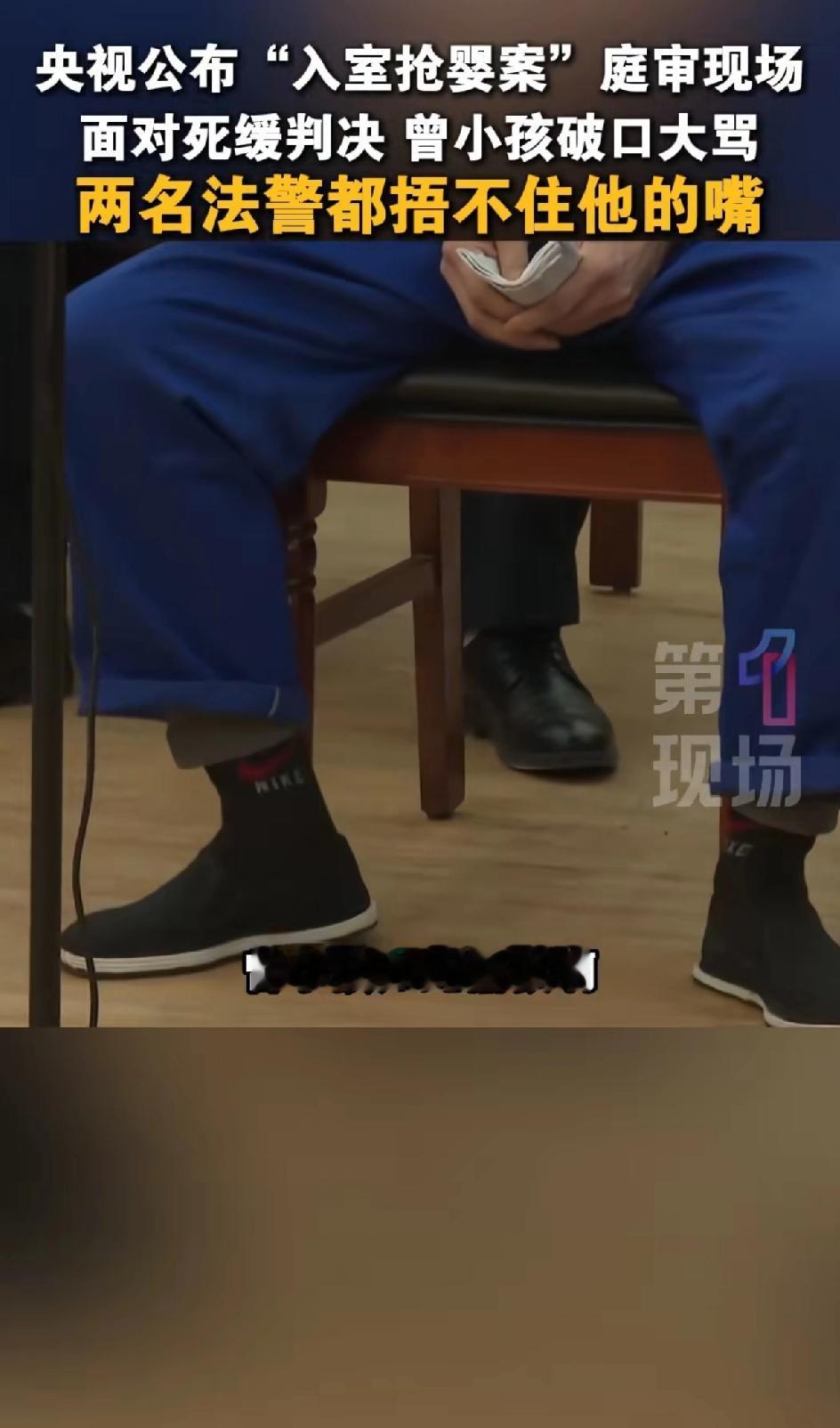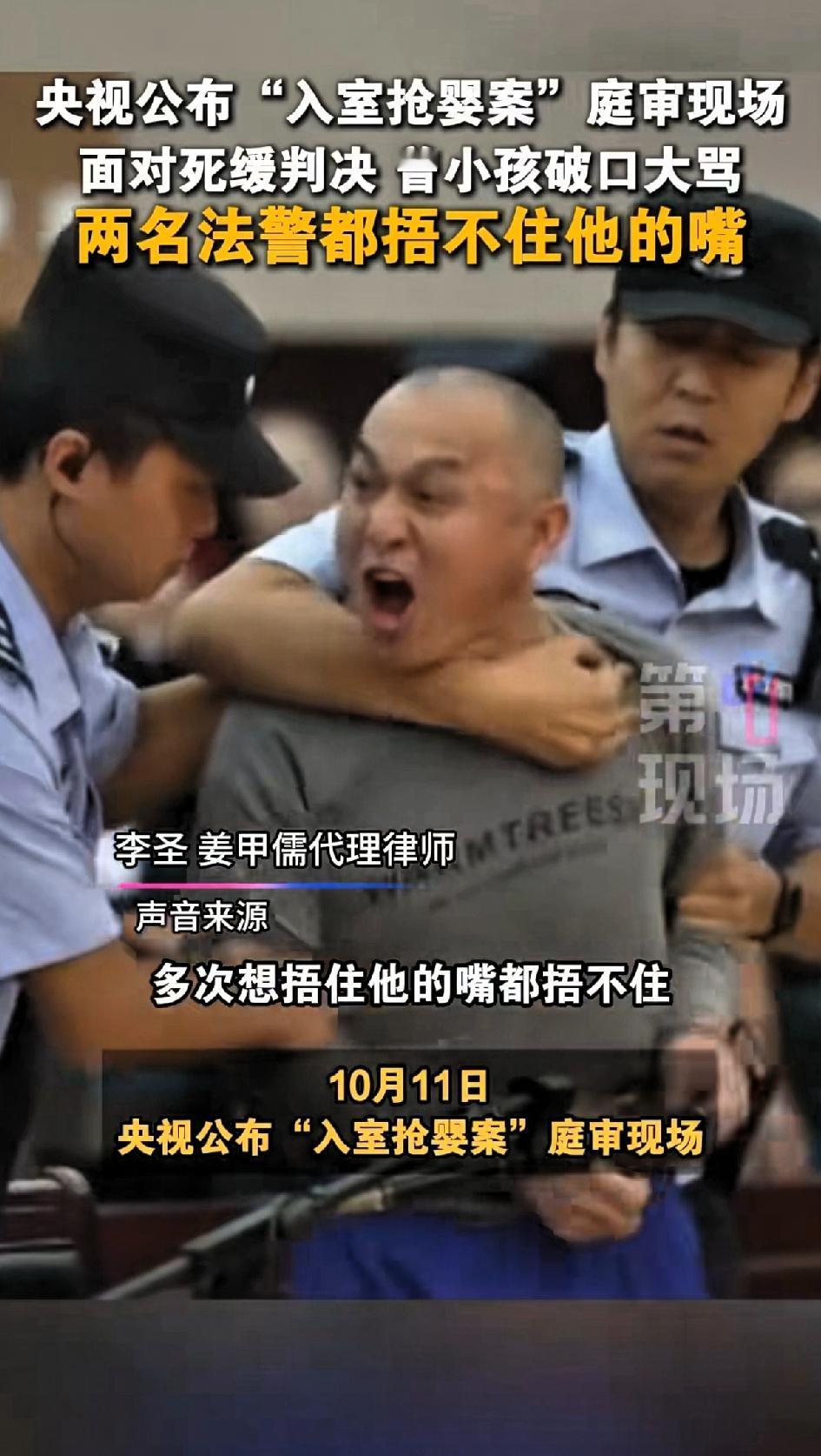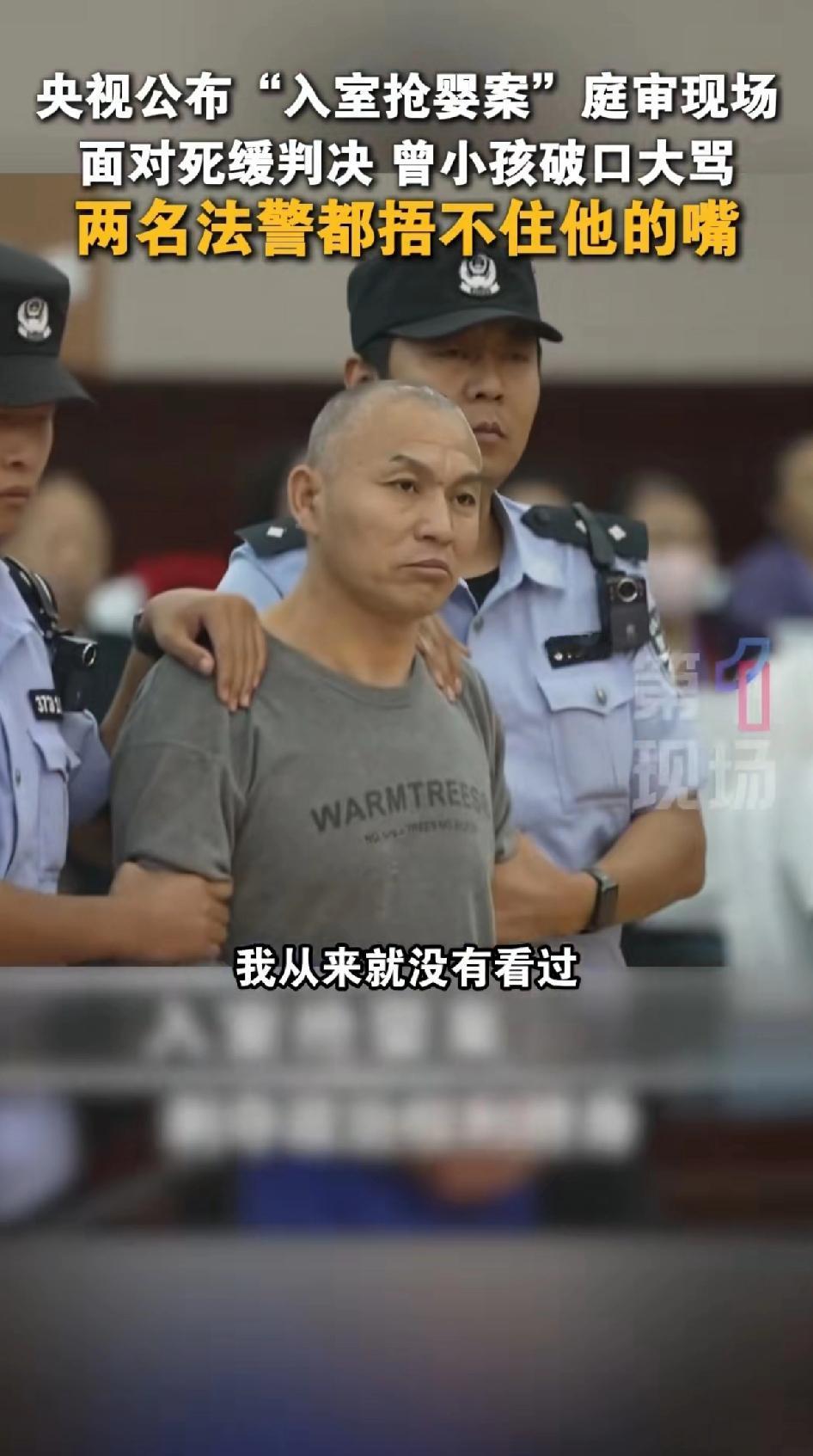 央视公布“入室抢婴案”庭审现场面对死缓判决,曾某孩破口大骂。两名法警多次想捂住他
