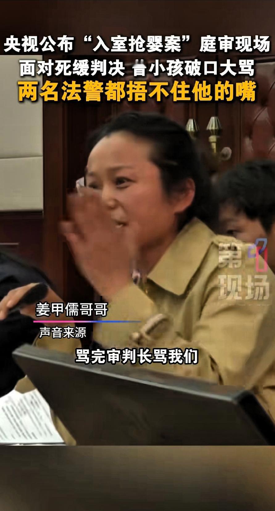 央视公布“入室抢婴案”庭审现场面对死缓判决,曾某孩破口大骂。两名法警多次想捂住他的嘴都捂不住。 山东“入室抢婴案”一审宣判。法院以拐卖儿童罪判曾某孩死缓,吕某东、王某勇无期徒刑,袁某贵有期徒刑十五年。 当年,曾某孩等人得知有人想抱养男婴,便打起坏主意。2006年12月4日凌晨,他们翻墙进入姜家,暴力控制大人后抢走8个月大的男婴姜甲儒。 事情发生快20年了,当事人承受了快20年的痛苦,坏人却还在逍遥法外 即使判决现场曾某还破口大骂。 真是天生的坏种,抢别人的孩子,不知悔改,还敢当庭破口大骂受害人和审判长。真是目无王法,无法无天。 主犯没有一丝悔改之意,应该判死刑,立即执行的那种! 庭审中,得知被判死缓的曾某孩完全“破防”,当庭辱骂姜甲儒及其亲属、法官。两名法警多次想捂他嘴都捂不住。姜甲儒父亲称曾某孩比第一次开庭还猖狂,他还表示要上诉,而姜家也考虑向检察院申请抗诉。这曾某孩如此嚣张,实在是让人愤怒! 地狱空荡荡,恶魔在人间。坏人即使做了丧尽天良的事,也从来不会自我反省。永远都是别人的问题。真不知道他怎么有脸骂别人?现场态度嚣张,坐在那里抖着腿,一脸的不服气。好像他是被冤枉了一样
